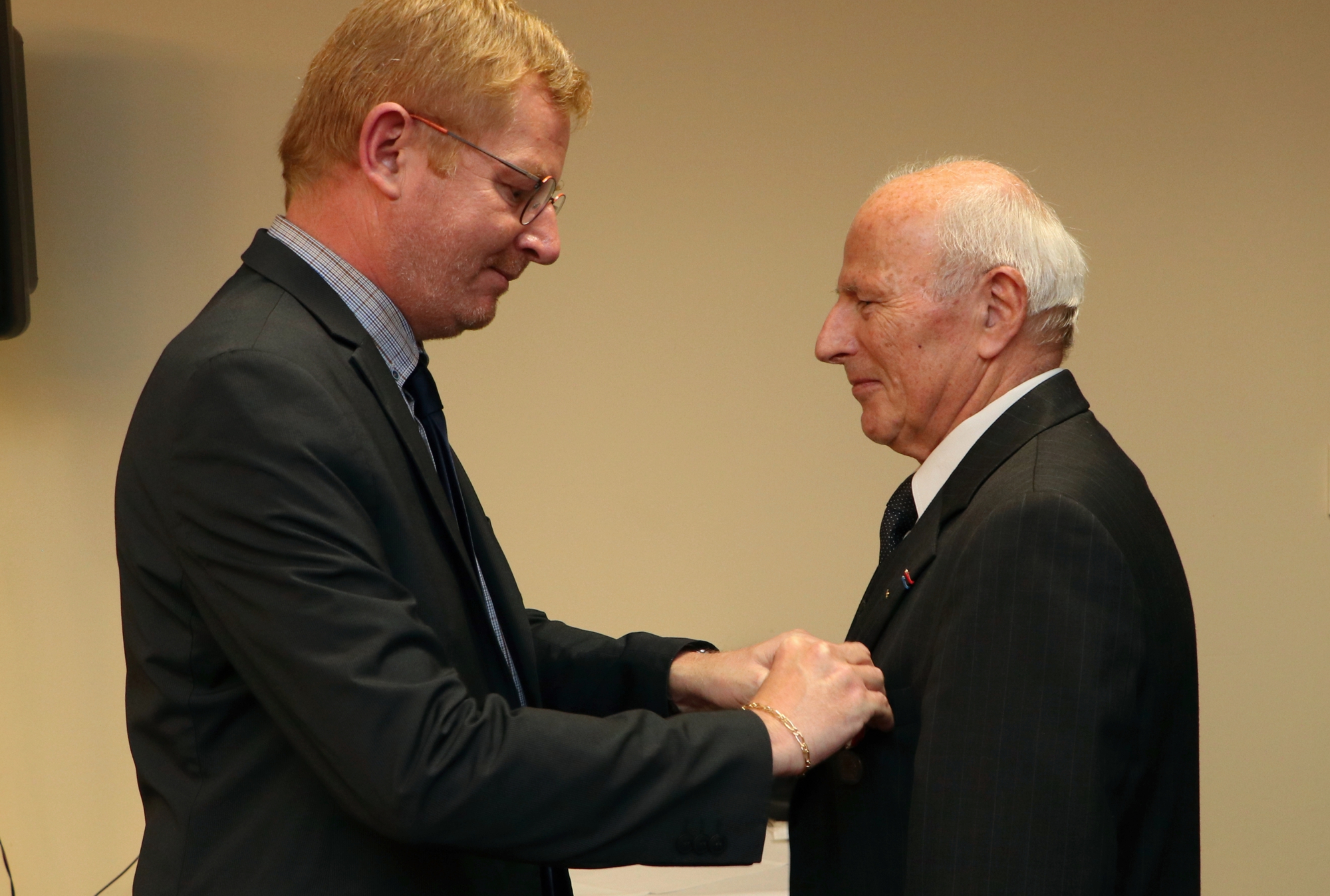 Der französische Generalkonsul im Saarland, Sébastien Girard, überreicht Honorarkonsul a.D. Michel Bouchon die Ehrenmedaille, die er vom französischen Außenminister verliehen bekam. Foto: Sascha Schmidt