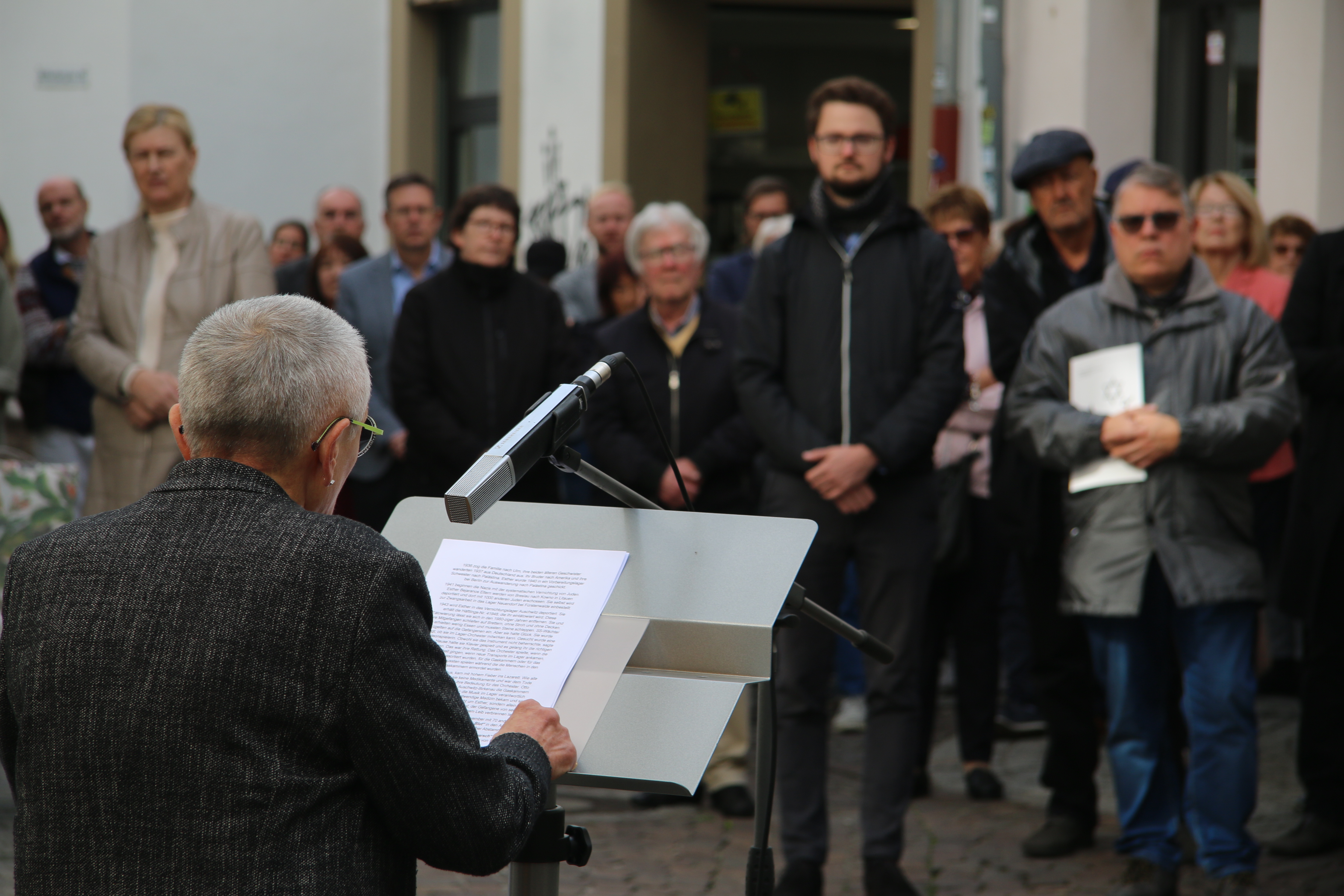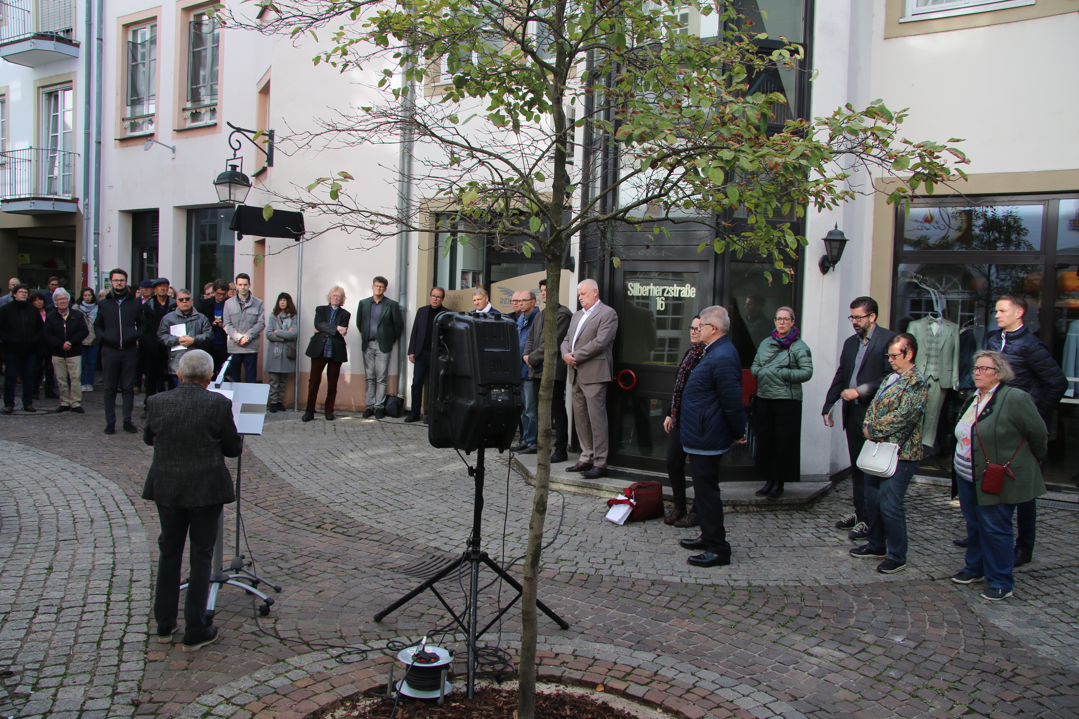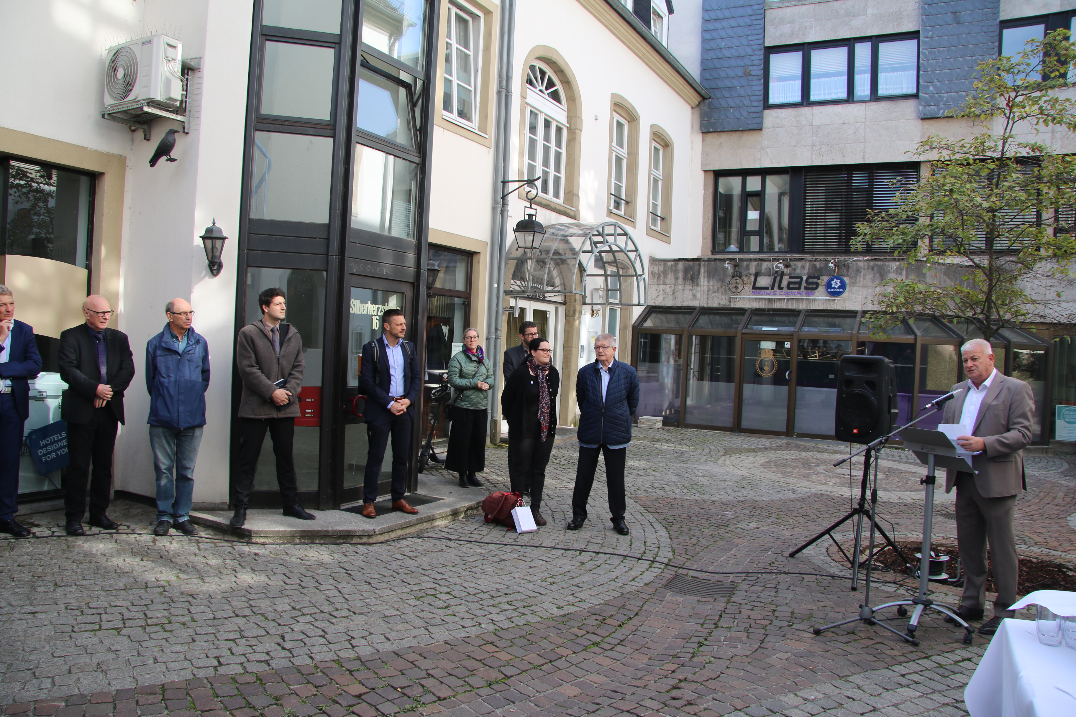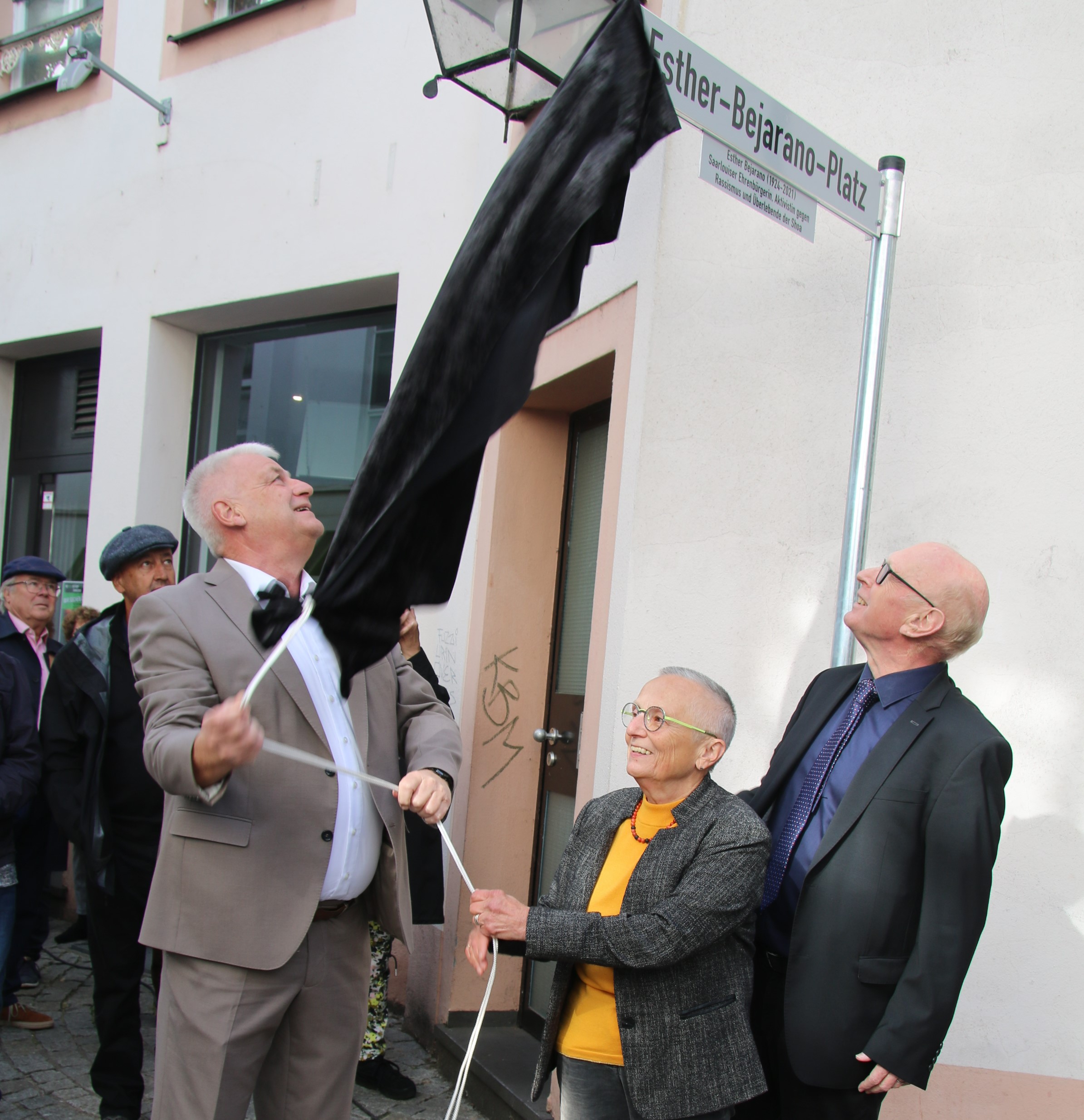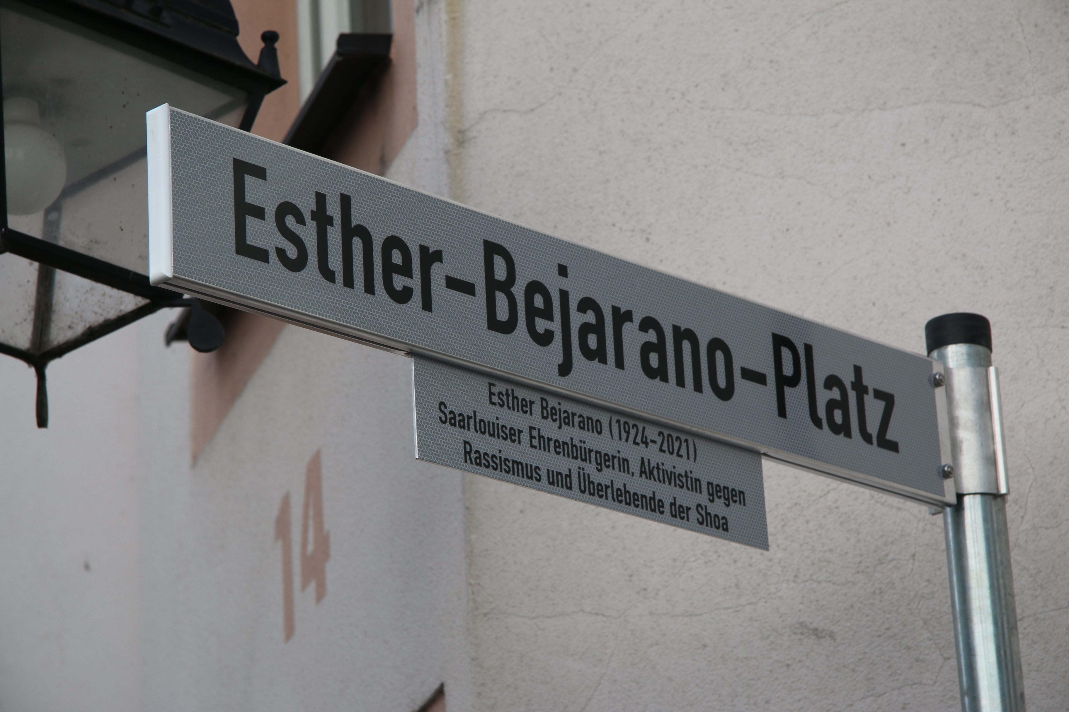 Oberbürgermeister Peter Demmer begrüßte die zahlreichen Gäste, darunter Ricarda Kunger, die Vorsitzende der Synagogengemeinde Saar, Prof. Dr. Roland Rixecker, den Beauftragten für jüdisches Leben im Saarland und die beiden Saarlouiser Ehrenbürger Erich Pohl und Alfred Gulden. „Dieser Platz, an dem wir heute stehen, hat eine starke Symbolkraft, liegt er doch unmittelbar an der ehemaligen jüdischen Synagoge, die Esther Bejarano mit ihrer Familie besucht hat und die während der Novemberpogrome 1938 zerstört wurde. Esthers Vater, Rudolf Loewy, war in der jüdischen Gemeinde in Saarlouis als Kantor und Lehrer tätig“, erläuterte er die Standortwahl und bedankte sich bei allen, die an der Umsetzung dieses wichtigen Projekts mitgearbeitet haben. „Mögen uns dieser Platz und das neue städtische Kinder-, Jugend- und Familienzentrum in der Dieselstraße, das im Oktober ebenfalls nach ihr benannt wird, immer an diese kleine, aber doch so große Frau erinnern. Es liegt in unser aller Verantwortung, ihr Engagement, dass sich Geschichte nicht wiederholt, in ihrem Sinne weiterzuführen und uns stets aktiv vehement gegen Rassismus und Diskriminierung einzusetzen“, so Demmer.