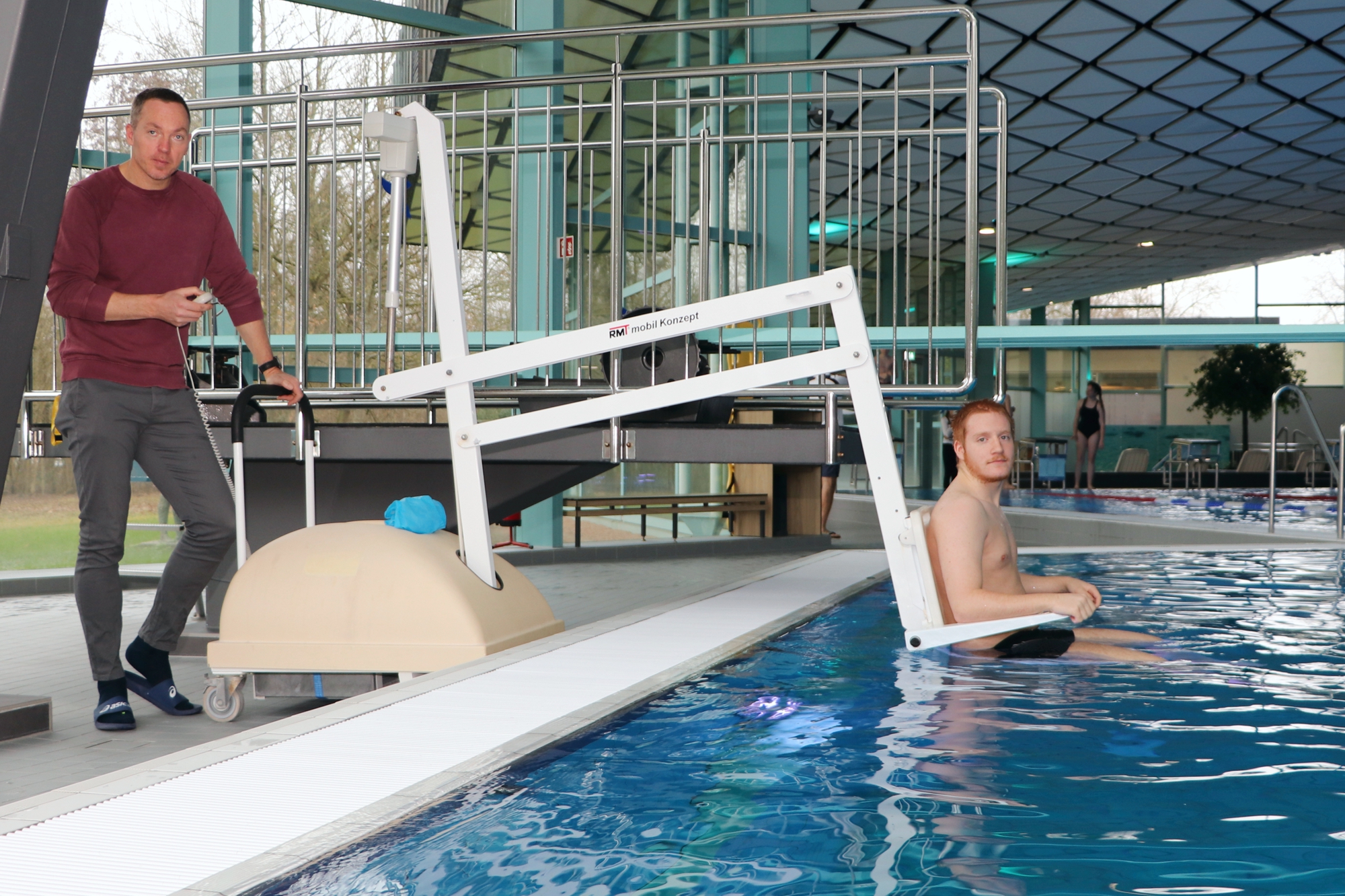 Mit dem mobilen Schwimmbadlift ist es problemlos möglich, Menschen mit Handicap vom Beckenrand ins Wasser zu lassen und sie wieder aus dem Wasser herauszuheben, wie es Betriebsleiter Thorsten Laurent mit Azubi Niklas Schmidt vorführt. Fotos: Sascha Schmidt