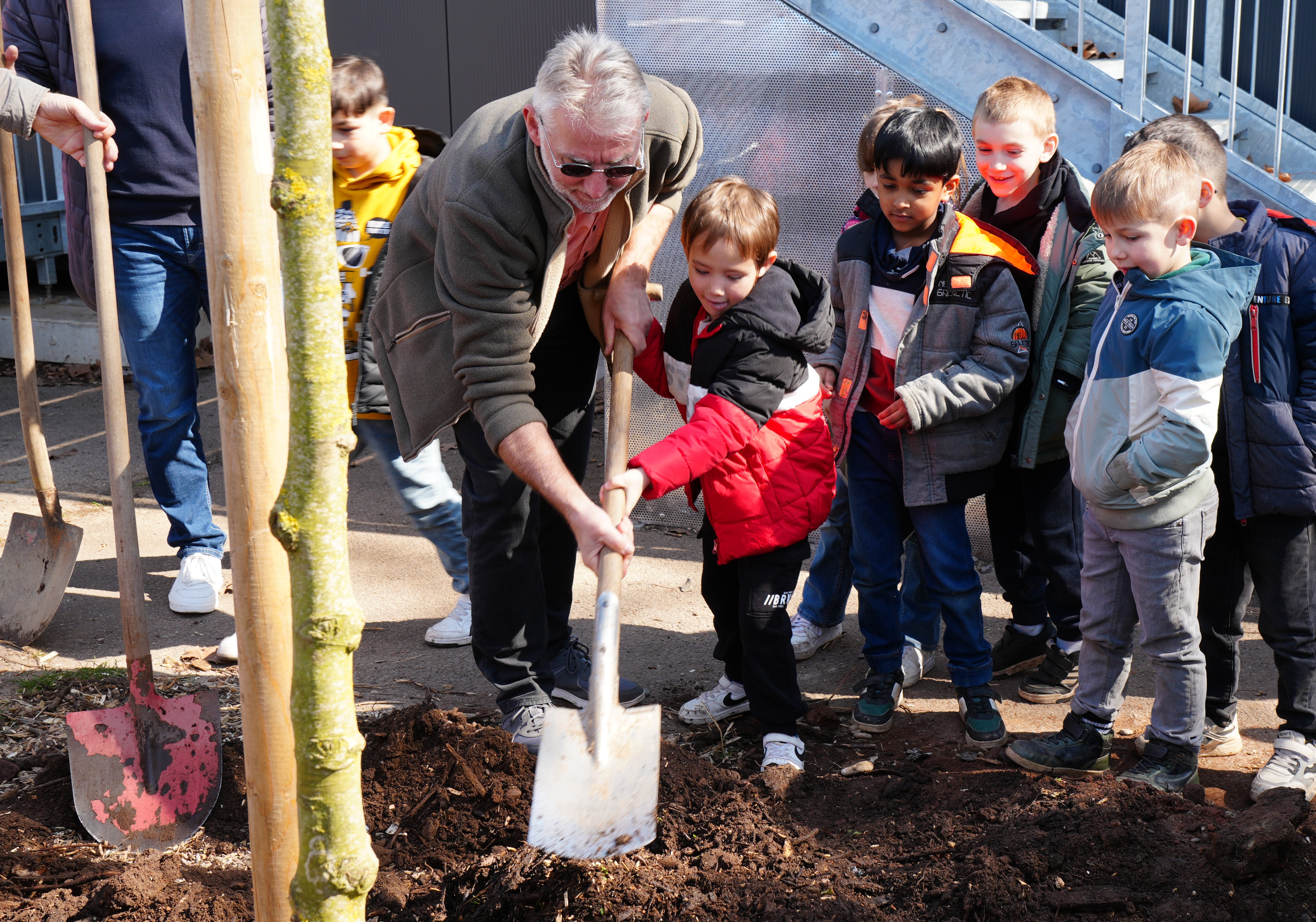 Auch der Beigeordnete Gerald Purucker unterstreicht: „Gerade in Zeiten des Klimawandels ist es wichtig, früh anzusetzen und Kinder für ökologische Zusammenhänge zu sensibilisieren. Die Baumpflanzaktion verbindet auf gelungene Weise Umweltbildung mit einem besonderen Erlebnis für die Erstklässlerinnen und Erstklässler.“