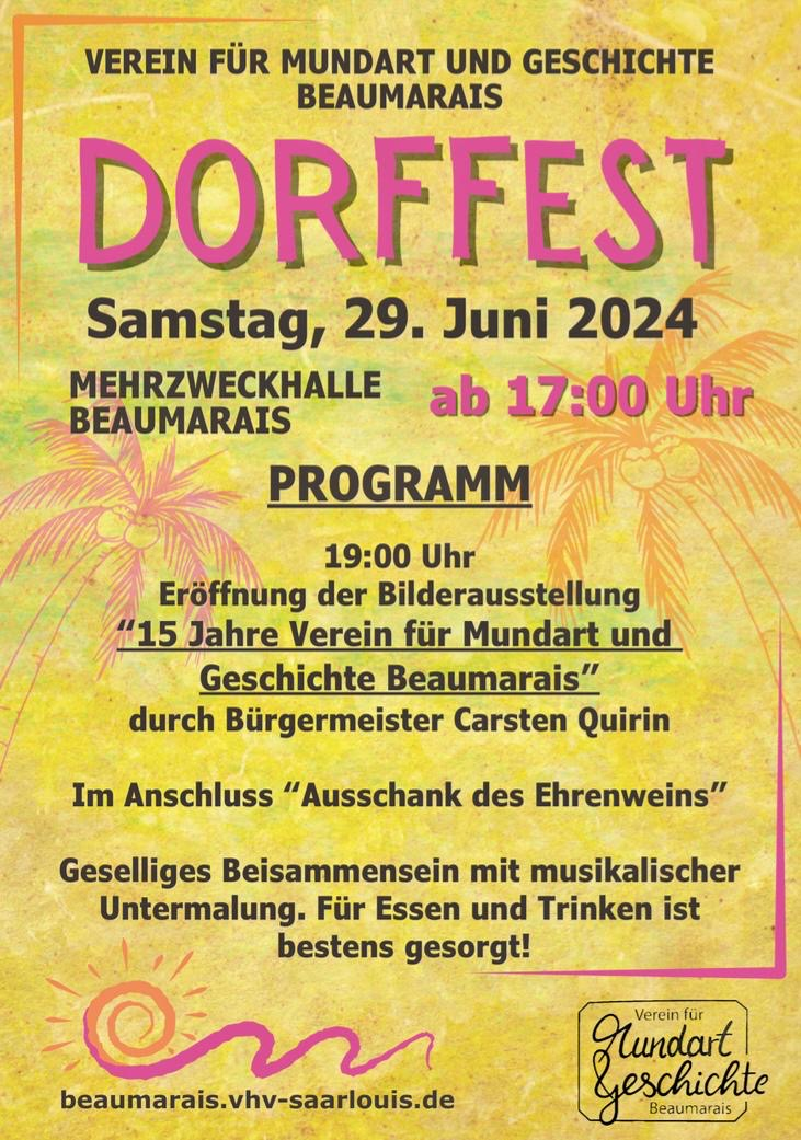 Der Verein für Mundart und Geschichte Beaumarais feiert am Samstag, 29. Juni um 17 Uhr sein 15-jähriges Vereinsjubiläum vor der Mehrzweckhalle Beaumarais. Die Schirmherrschaft hat Bürgermeister Carsten Quirin übernommen.