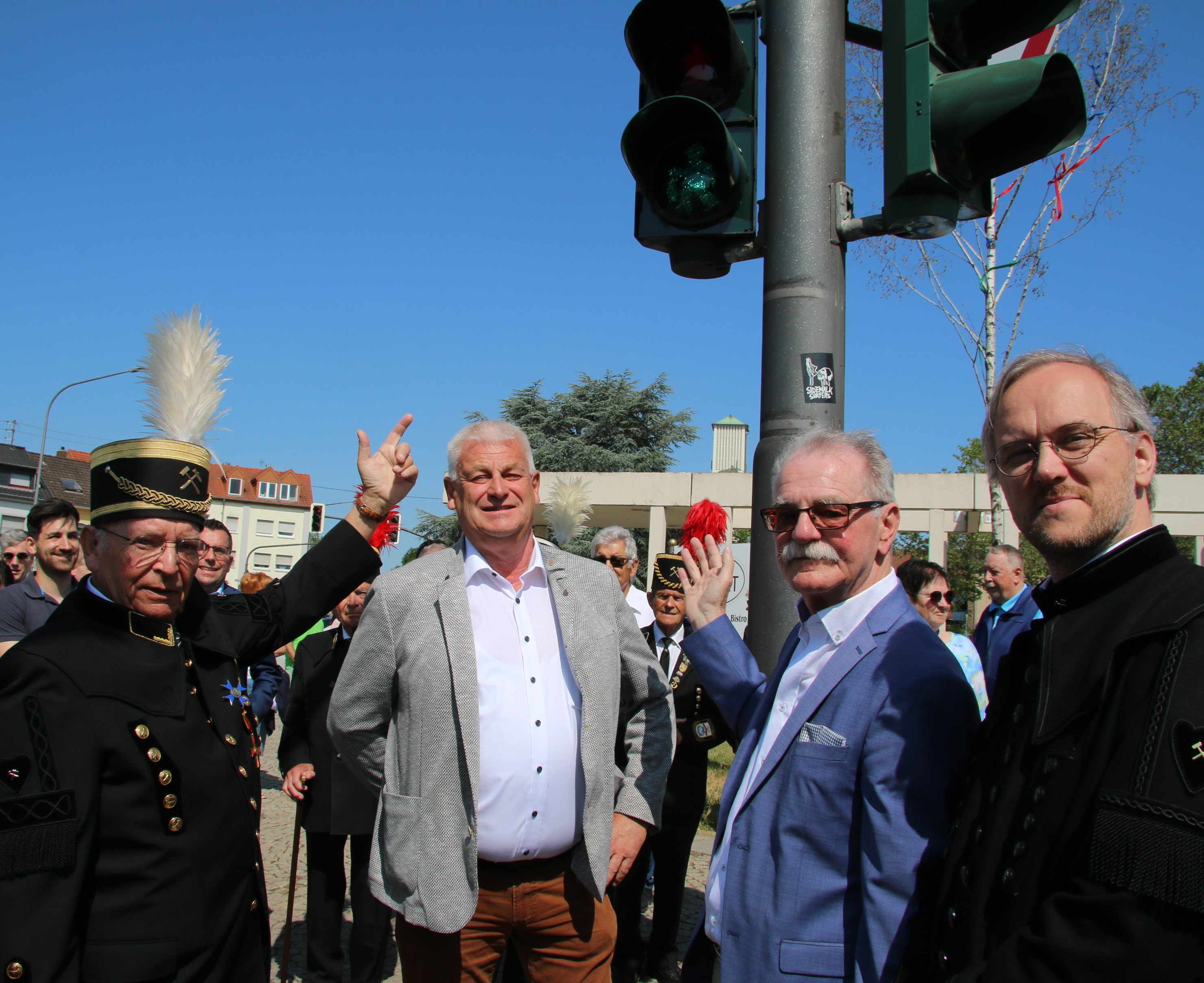 Im Anschluss an die Benennung des Platzes ging es gemeinsam zur Einmündung der Ulanenstraße in die Saarbrücker Straße. Vor dem Vereinshaus nahm man die frisch umgerüstete Fußgänger-Ampelanlage, die einen Bergmann samt seinem Geleucht darstellt. „Sie erleuchten uns den Weg über die Straße, wie einst die Bergmanns-Leuchte den Weg in die Grube; sie sollen „die Bergbauvergangenheit stets im Bewusstsein halten und an die Generationen, die diese Zeit nur vom Hörensagen kennen, weitergeben“, so Klaus Hiery.