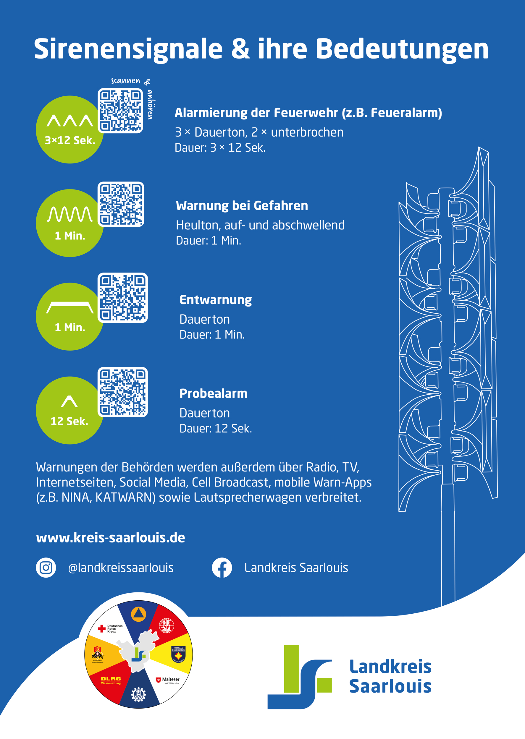 Parallel dazu können auch kommunale Warnmittel wie Sirenen und Lautsprecherwagen geprüft werden. Im Falle einer Warnung wird bundeseinheitlich ein einminütiger, auf- und abschwellender Heulton verwendet.