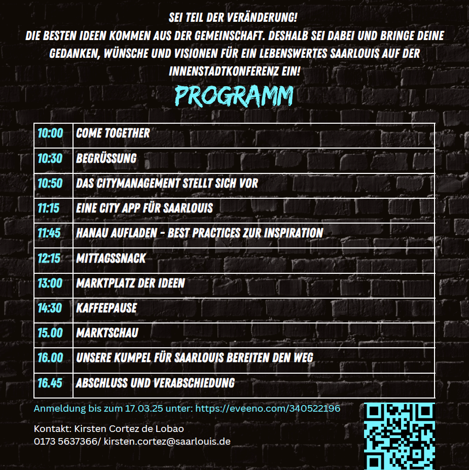 Das Citymanagement der Europastadt Saarlouis lädt alle Innenstadtakteure herzlich zur Innenstadtkonferenz "Cityboost für Saarlouis" ein. Die Veranstaltung findet am 24. März 2025 von 10 bis 17 Uhr im Theater am Ring statt. Sie bietet eine Plattform für kreativen Austausch sowie die Entwicklung innovativer Ideen zur Belebung und Weiterentwicklung der Innenstadt.