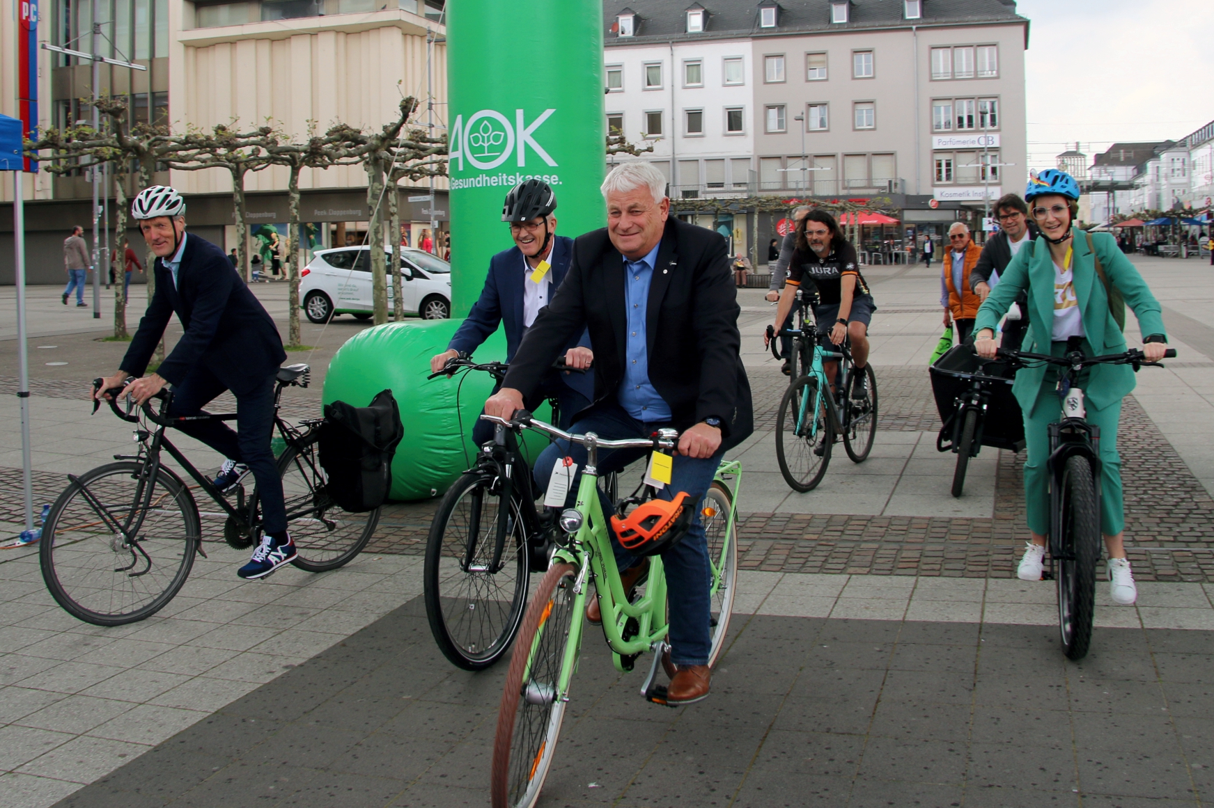 Zum Auftakt der Aktion von ADFC und AOK, die seit vielen Jahren Partnerin des städtischen Gesundheitsmanagements ist, kamen OB Peter Demmer, AOK-Regionalleiterin Rike Jungfleisch, der Leiter der Obersten Straßenbaubehörde im Umweltministerium, Werner Schmitt, sowie ADFC Saar-Landessprecher Thomas Fläschner auf dem Kleinen Markt in Saarlouis zusammen.