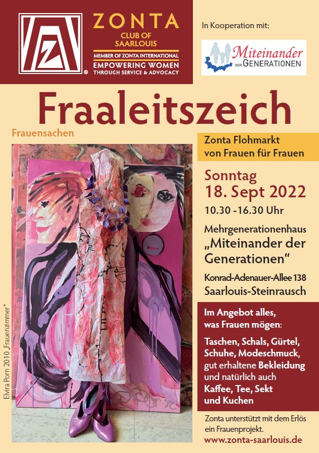 Der beliebte und besondere Frauenflohmarkt des Zonta Club Saarlouis kann im Jahr 2022 endlich wieder stattfinden. Am 18. September gibt es zum 6. Mal wieder alles, was Frauen gerne haben: Taschen, Schuhe, Gürtel, Schals, Modeschmuck und gut erhaltene Kleidung in vielen Größen. Besonderes Interesse finden auch die zahlreichen Designerteile von renommierten Marken, die zu einem kleinen Preis offeriert werden.