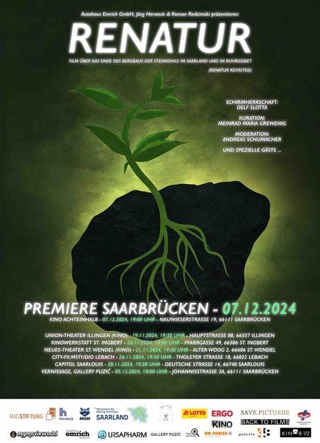 Der Film „ReNatur“, eine Produktion des saarländischen Filmlabels Save Pictures, feiert am 7.12.2024 im Kino achteinhalb in Saarbrücken Premiere. Er beleuchtet das Ende des Steinkohle-Bergbaus im Saarland und Ruhrgebiet und ist anschließend auch in weiteren Kinos im Saarland zu sehen. Die Vorstellung in der Capitol Movie World in Saarlouis findet am Donnerstag, 28.11.2024 um 19.30 Uhr statt.
