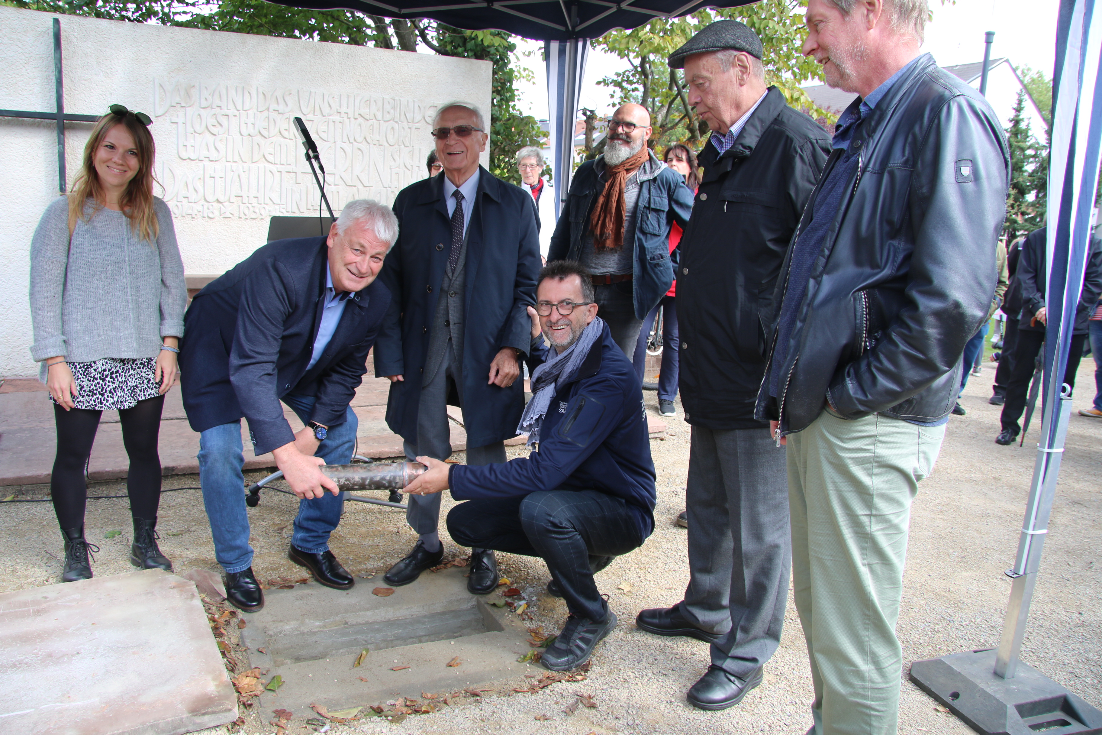 Im Rahmen der Feierstunde wurde nicht nur der Alte Pfarrgarten eröffnet, sondern auch die zu Beginn der Bauarbeiten am Fuße des Denkmals für die Opfer der Weltkriege aufgefundene Munitionshülse wieder in die Erde verbracht. Neben den Dokumenten und Gegenständen, die bereits in der Hülse waren, wurden eine handgeschriebene neue Urkunde, Euro-Geldmünzen, Fotos von dem ersten Festakt 1958 und Zeitungsartikel für die zukünftigen Finder hinzugefügt.