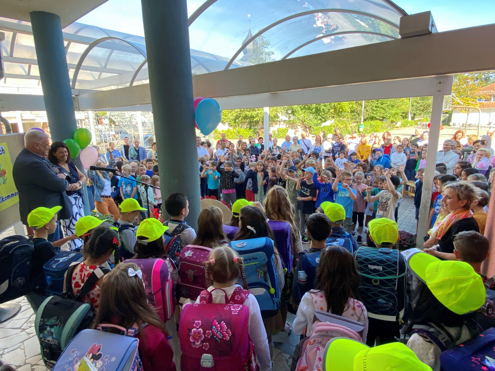 Nach Vorführungen der höheren Klassenstufen begrüßte auch OB Peter Demmer die Erstklässler und wünschte ihnen viel Glück für ihren neuen Lebensabschnitt. Von den Kolleginnen des Schulamtes erhielten alle Schülerinnen und Schüler des Jahrgangs eine Urkunde sowie eine gelbe Mütze, mit der sie die Verkehrsteilnehmer auf ihrem Schulweg auf sich aufmerksam machen können. Im Anschluss ging es dann zum ersten Mal in ihre neue Klasse, wo die Kinder gemeinsam ihre erste Schulstunde erlebten.