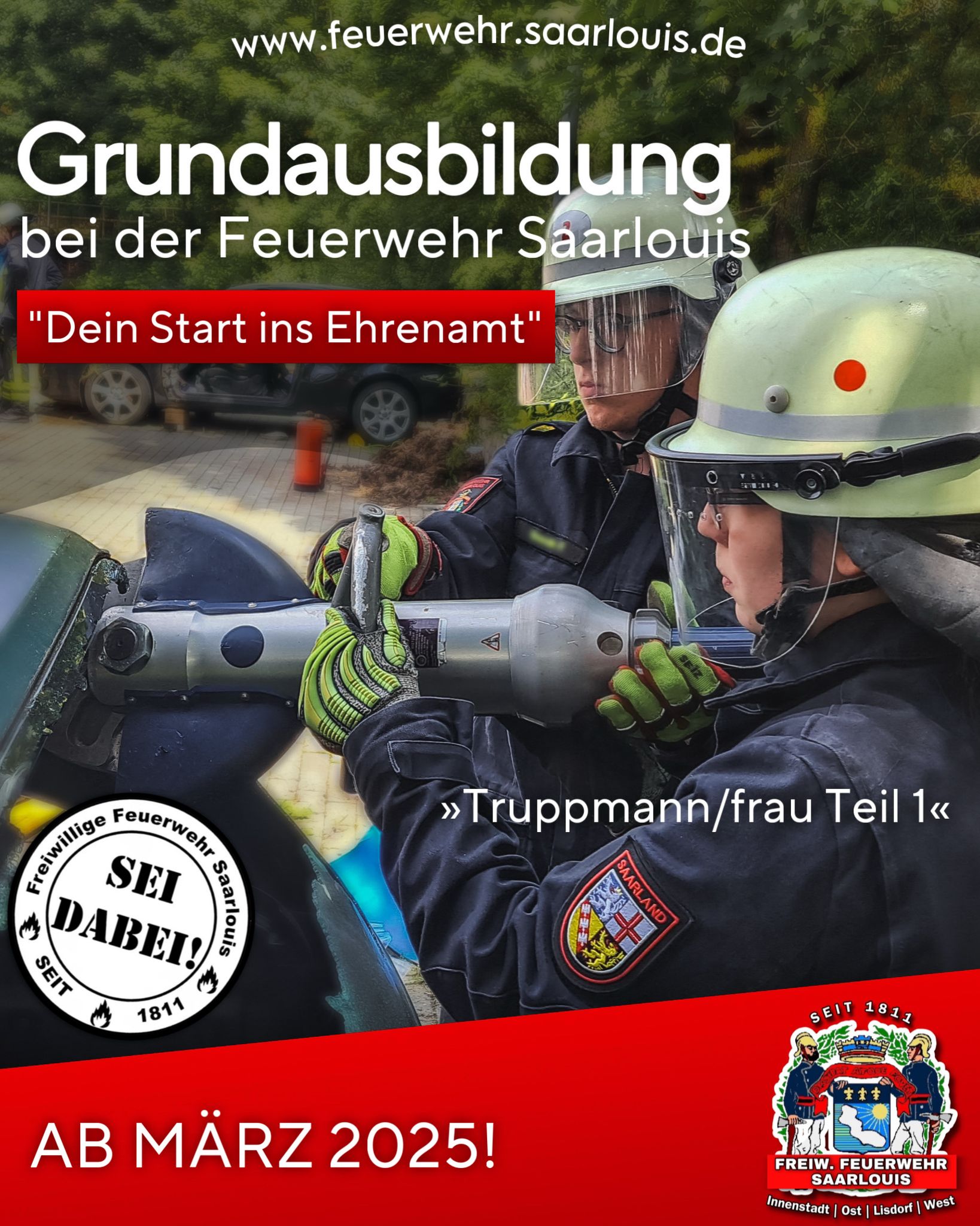 Sie ist die Basis für jede Feuerwehrkameradin und jeden Feuerwehrkameraden und der ideale Einstieg in ein wichtiges Ehrenamt: Der Lehrgang „Truppmann / -frau 1“ ist die sogenannte Grundausbildung der Feuerwehr und die Grundlage für ein aktives Mitwirken im Feuerwehrdienst. Im März bietet die Freiwillige Feuerwehr Saarlouis den Lehrgang an. Teilnehmen können alle, die in Saarlouis inklusive der Stadtteile wohnen und die im Alter zwischen 17 und 50 Jahren sind. Vorkenntnisse oder eine spezielle Ausbildung ist nicht vonnöten, sodass sich der Kurs auch ideal für Quereinsteiger eignet. Kleidung wird gestellt.