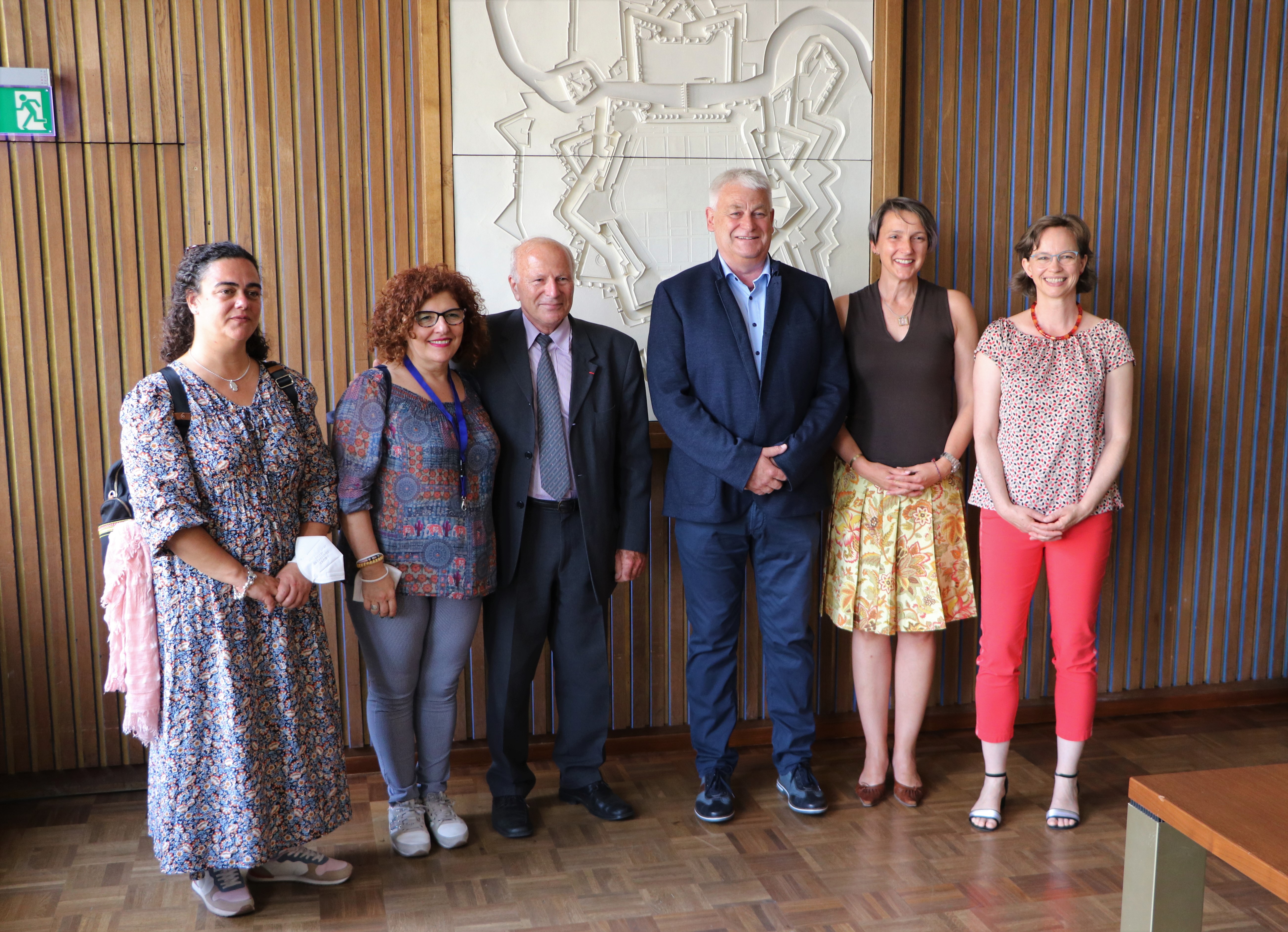 OB Peter Demmer (mitte rechts) und Michel Bouchon (mitte links) zusammen mit den Lehrerinnen der deutschen und spanischen Schulen. (Foto: Sophia Bonnaire)