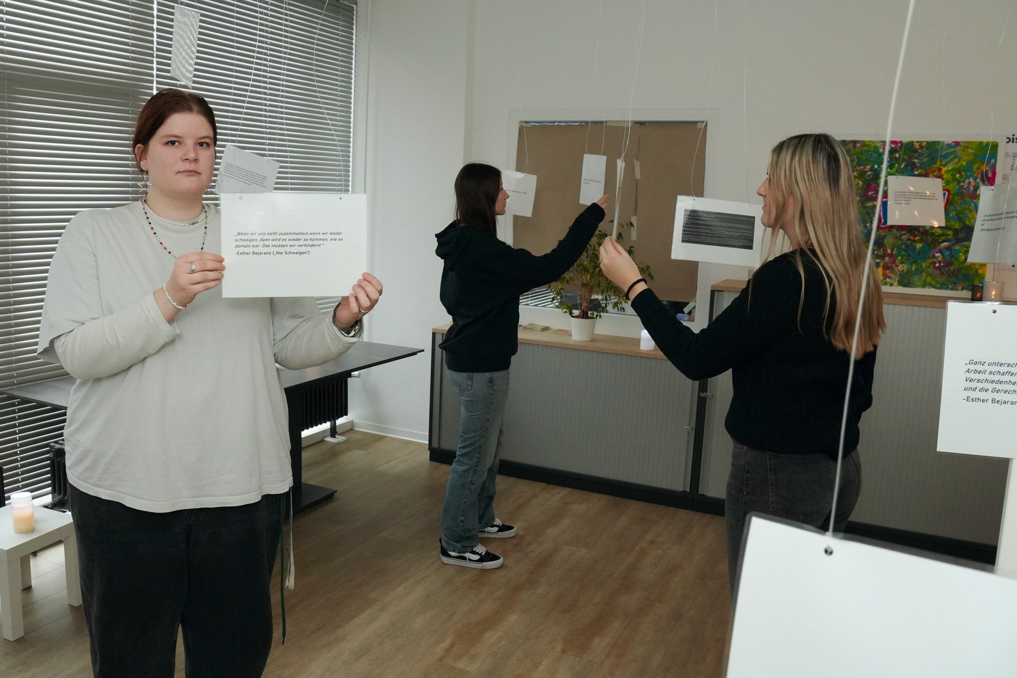 Louisa Stumpf, (links) Bundesfreiwillige, kreierte den „Raum der Stille“, wo man Esthers Zitaten auf Augenhöhe begegnete.
