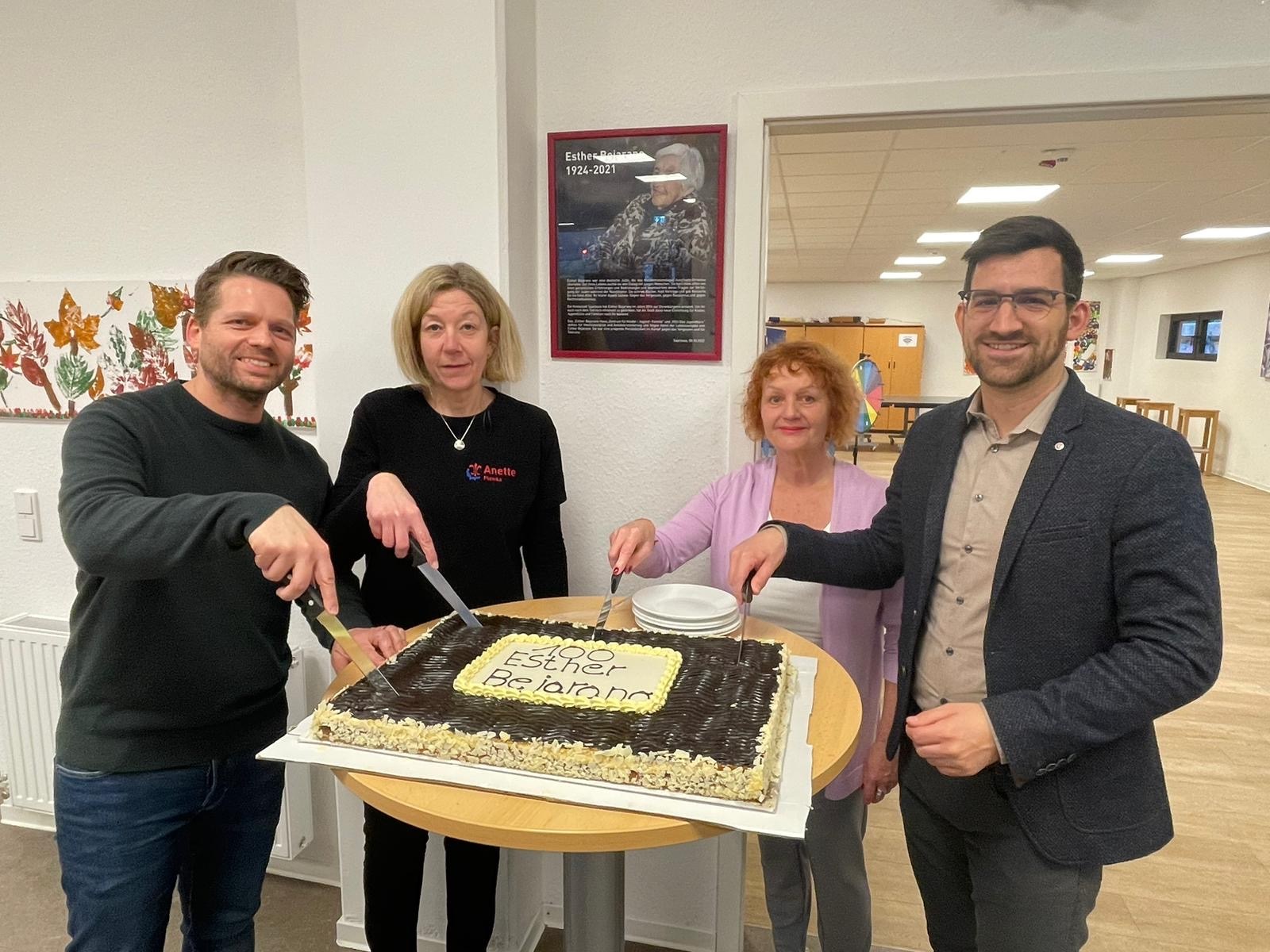 Die Party wurde offiziell eröffnet durch das Anschneiden der Geburtstags-Donauwelle, die Globus Saarlouis eigens für die Feier gebacken hatte. Für Abwechslung auf dem Büfett sorgten vier Frauen aus der Gruppe „Willkommen Mama“, die türkische und arabische Spezialitäten mitgebracht hatten. Das Haus-Team hatte Waffeln und leckere Sandwiches vorbereitet. Bei leckerem Essen und guten Gesprächen kam man immer wieder auf Esther zu sprechen, ihren Mut, ihre Energie und ihren Lebenswillen. Denn das Esther-Bejarano-Haus verkörpert mit seinen unterschiedlichen Angeboten die Ideale und Ziele, für die sie gelebt hat. Esther Bejarano verstarb am 10. Juli 2021. „Gegen das Vergessen“, war einer ihrer Leitsätze. Durch die Aktivitäten der Stadt, im kommenden Jahr soll es eine Esther-Bejarano-Medaille für besondere Verdienste geben, wird sie unvergessen bleiben.