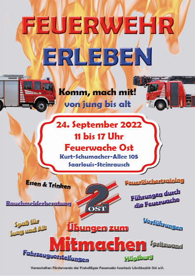 Am 24.09.22 findet im Löschbezirk Ost der Freiwilligen Feuerwehr Saarlouis der Feuerwehraktionstag unter dem Motto "Feuerwehr erleben - Komm mach mit!" statt.