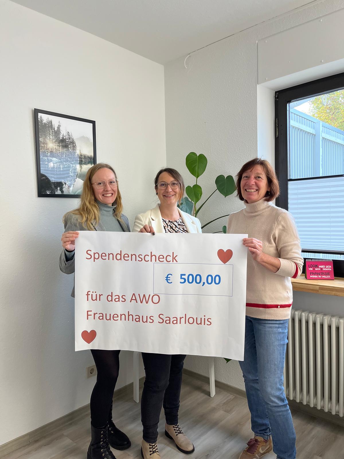 Das AWO Frauenhaus in Saarlouis bekam nun den ersten Teil der Spende. Die Leiterin des Frauenhauses Marie Jerzenbeck bedankte sich und freute sich sehr darüber. “Mit dieser großzügigen Spende wird das Projekt „Gute Berührung“ gefördert. Vielen Frauen wurde körperliche oder sexuelle Gewalt angetan. Mit Meditation, Atemübungen und auch mit positiven Körperberührungen, möchten wir den Frauen wieder ein wertschätzendes Gefühl für sich selbst und ihren Körper vermitteln. Des Weiteren wird das Geld für verschiedene Angebote wie zum Beispiel Kreatives Gestalten oder Ausflüge genutzt“ erklärt Marie Jerzenbeck.