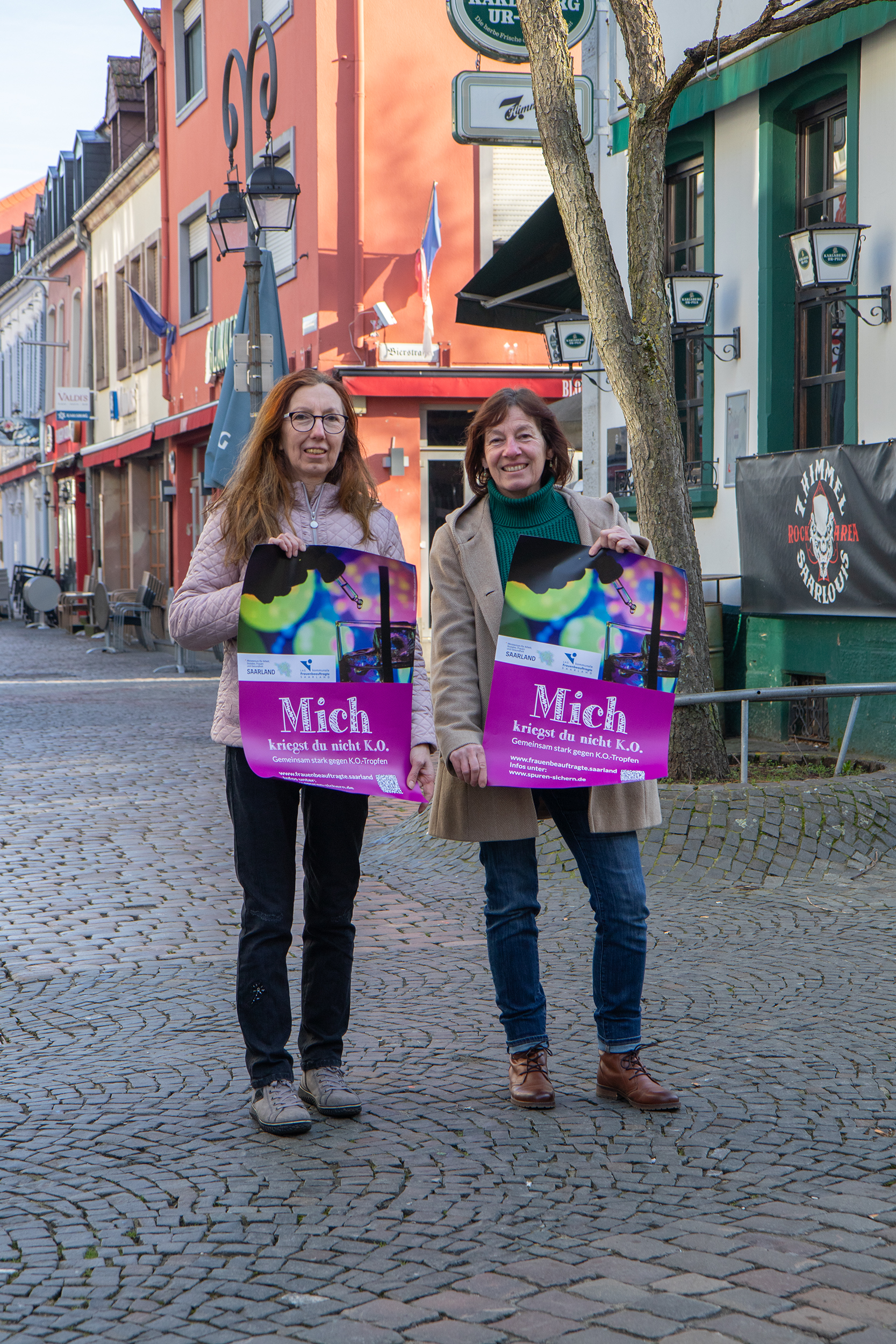 Im Rahmen der saarlandweiten Kampagne „Mich kriegst du nicht K.O.“ haben die beiden Frauenbeauftragten Banner angebracht, um möglichst viele Menschen auf die Problematik aufmerksam zu machen. Zudem waren sie in den Gastronomiebetrieben der Saarlouiser Altstadt unterwegs, um die Wirtinnen und Wirte für die Thematik zu sensibilisieren und ihnen Infomaterialien für ihre Gäste an die Hand zu geben. Des Weiteren werden ab sofort auch in vielen Bussen der KVS entsprechende Plakate aushängen.
