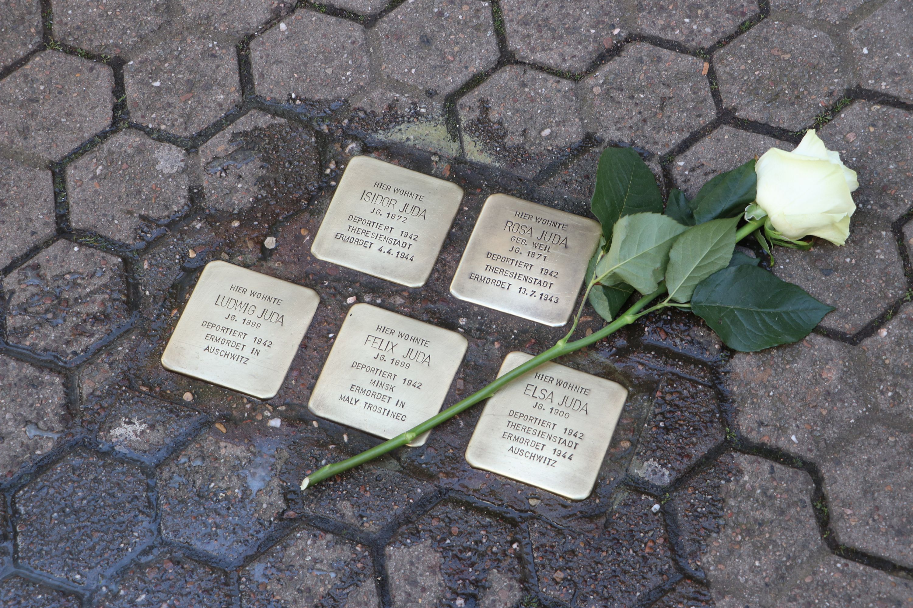 Als Zeichen der Anteilnahme legten die Anwesenden Rosen zu den Stolpersteinen. (Foto: Sophia Bonnaire)