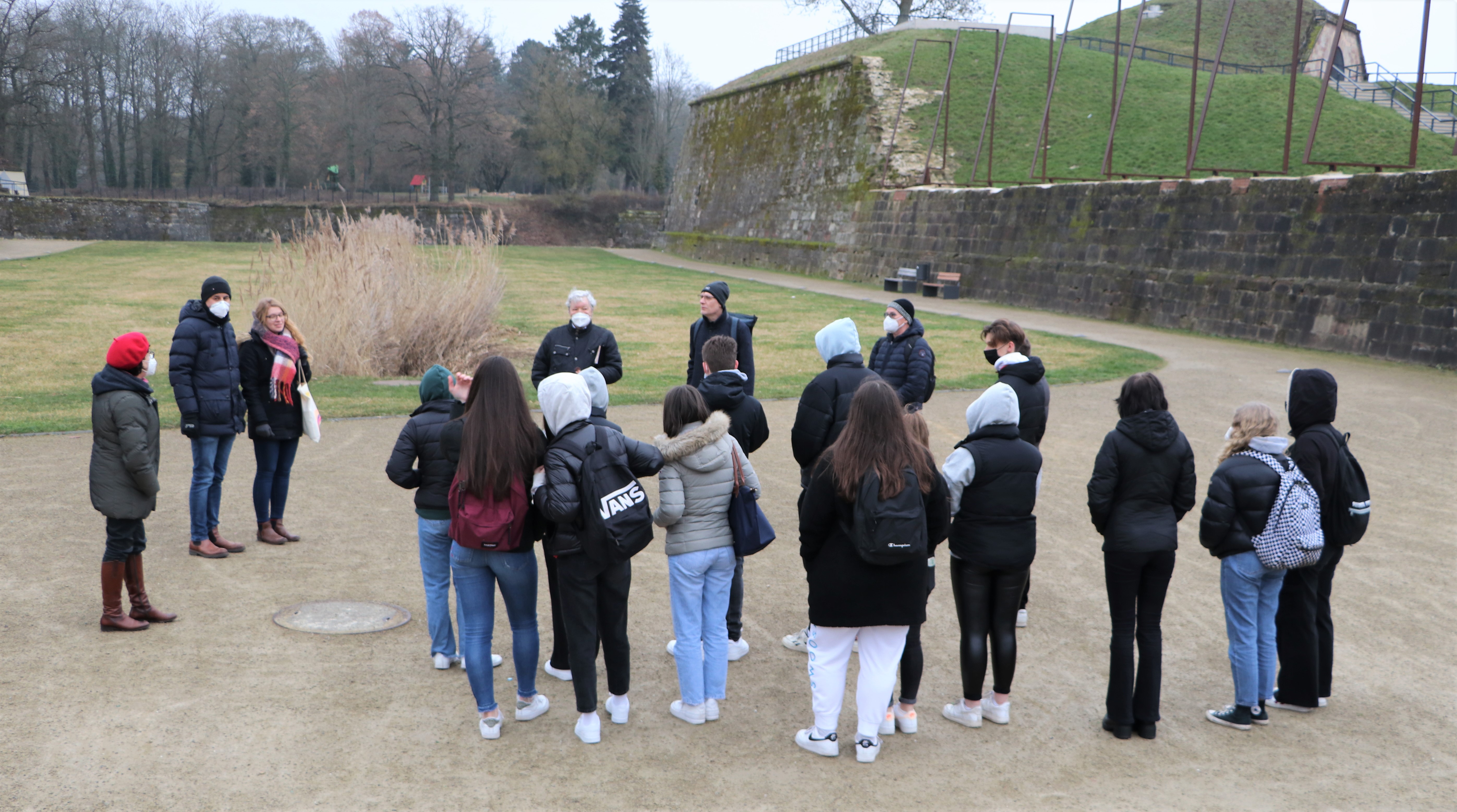 Schüler des Saarlouiser Gymnasiums am Stadtgarten zusammen mit den Vertretern des ökumenischen Arbeitskreises beim Auftakt der Veranstaltungen am 27.01 am Ravelin V. (Foto: Sophia Bonnaire)