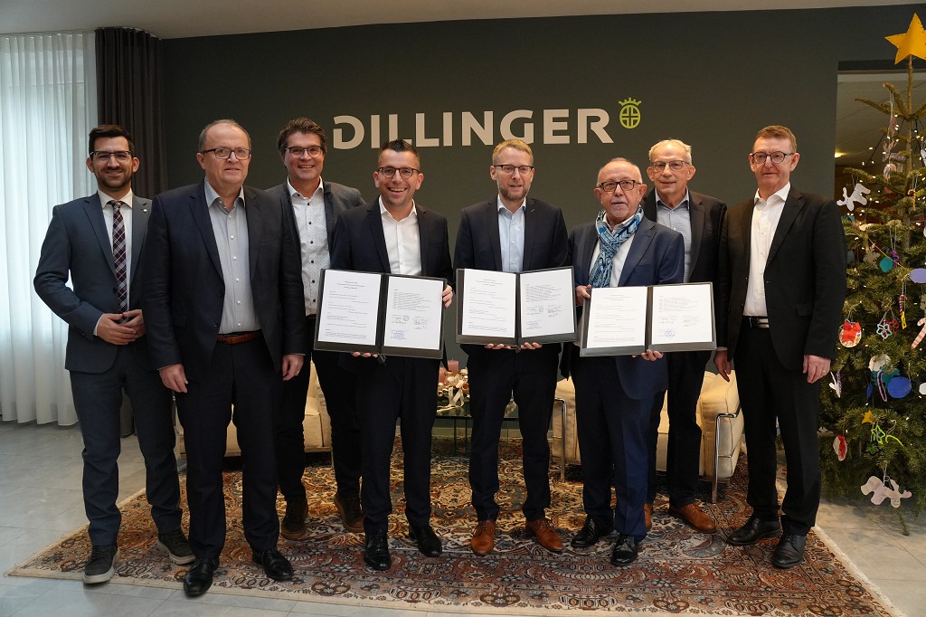 „Das ist ein historischer Tag für die Hüttenstadt Dillingen und die Europastadt Saar-louis“, sagen der Saarlouiser Oberbürgermeister Marc Speicher und der Dillinger Bürgermeister Franz-Josef Berg. „Wir geben grünes Licht für grünen Stahl und ma-chen damit den Weg frei für einen wesentlichen Teil der wirtschaftlichen Transfor-mation in der Region und des Saarlandes. Stahl ist Zukunft und wir müssen gemein-sam dafür sorgen, die industrielle Basis unseres Landes langfristig zu sichern. Die Kooperation zwischen den beiden Städten und Dillinger war von hohem gegenseiti-gem Vertrauen geprägt. Das hat das Rekordtempo der Verfahren erst ermöglicht.“ Im Gästehaus von Dillinger unterzeichneten der Saarlouiser Oberbürgermeister Marc Speicher, der Dillinger Bürgermeister Franz-Josef Berg, Stefan Rauber, Vor-standsvorsitzender von Dillinger sowie Dr. Michael Bott von Dillinger einen städte-baulichen Vertrag. Am Abend folgen hierzu Stadtratsbeschlüsse, um damit den Weg frei zu machen für grünen Stahl.