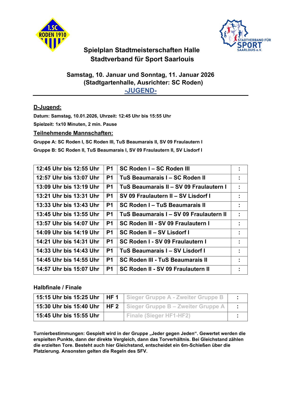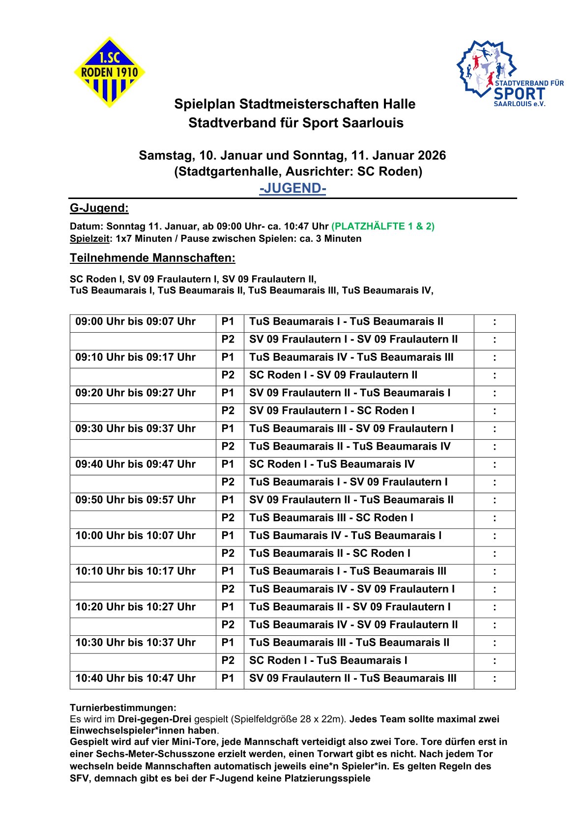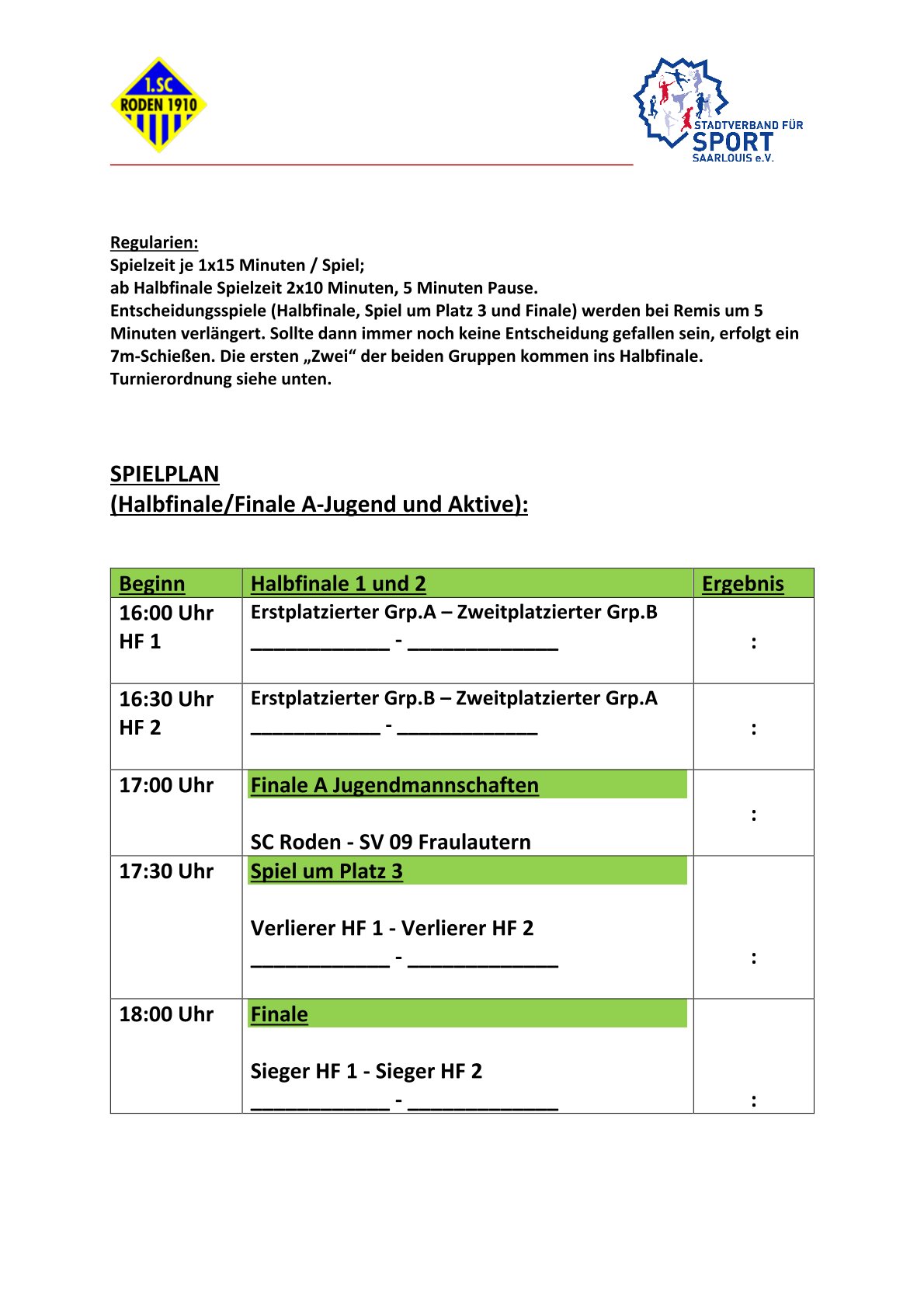 Der Stadtverband für Sport Saarlouis wünscht allen teilnehmenden Mannschaften viel Erfolg und faire Spiele sowie dem diesjährigen Ausrichter, dem SC Roden, ein gutes Gelingen.