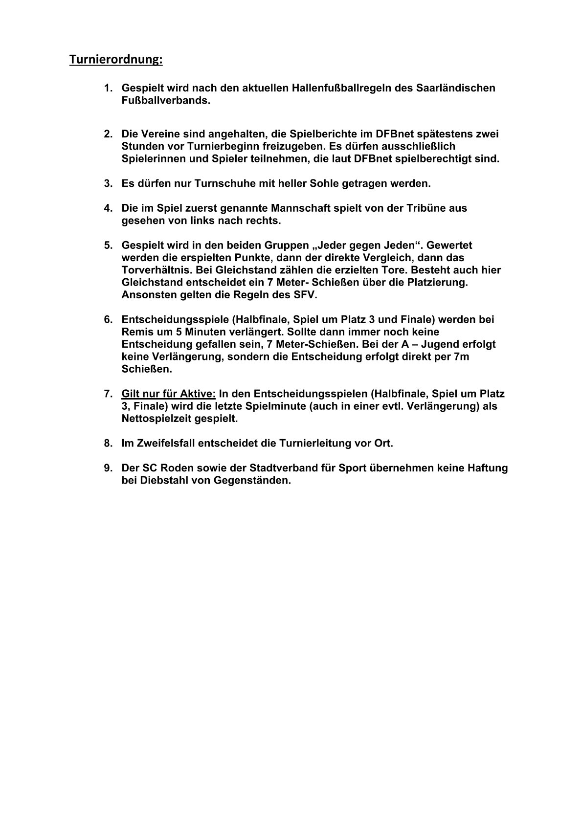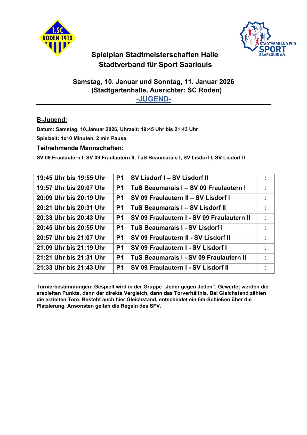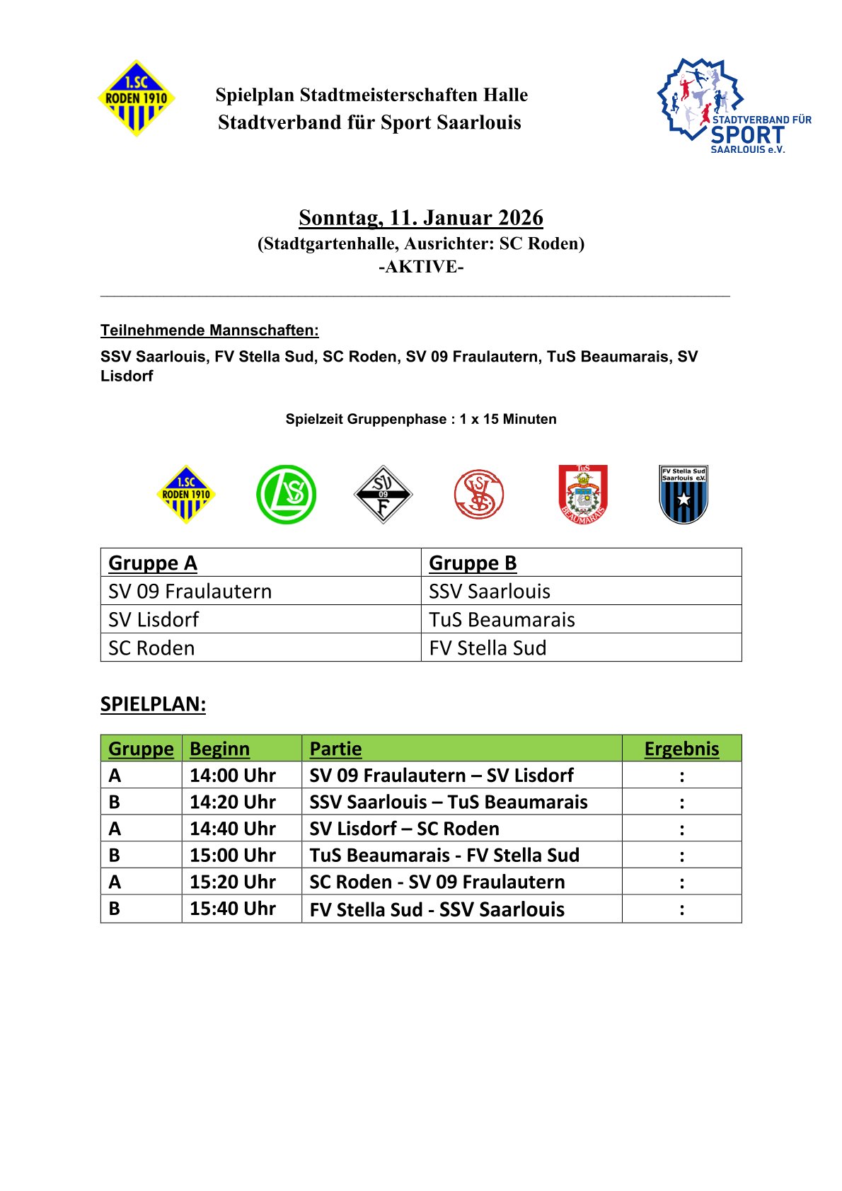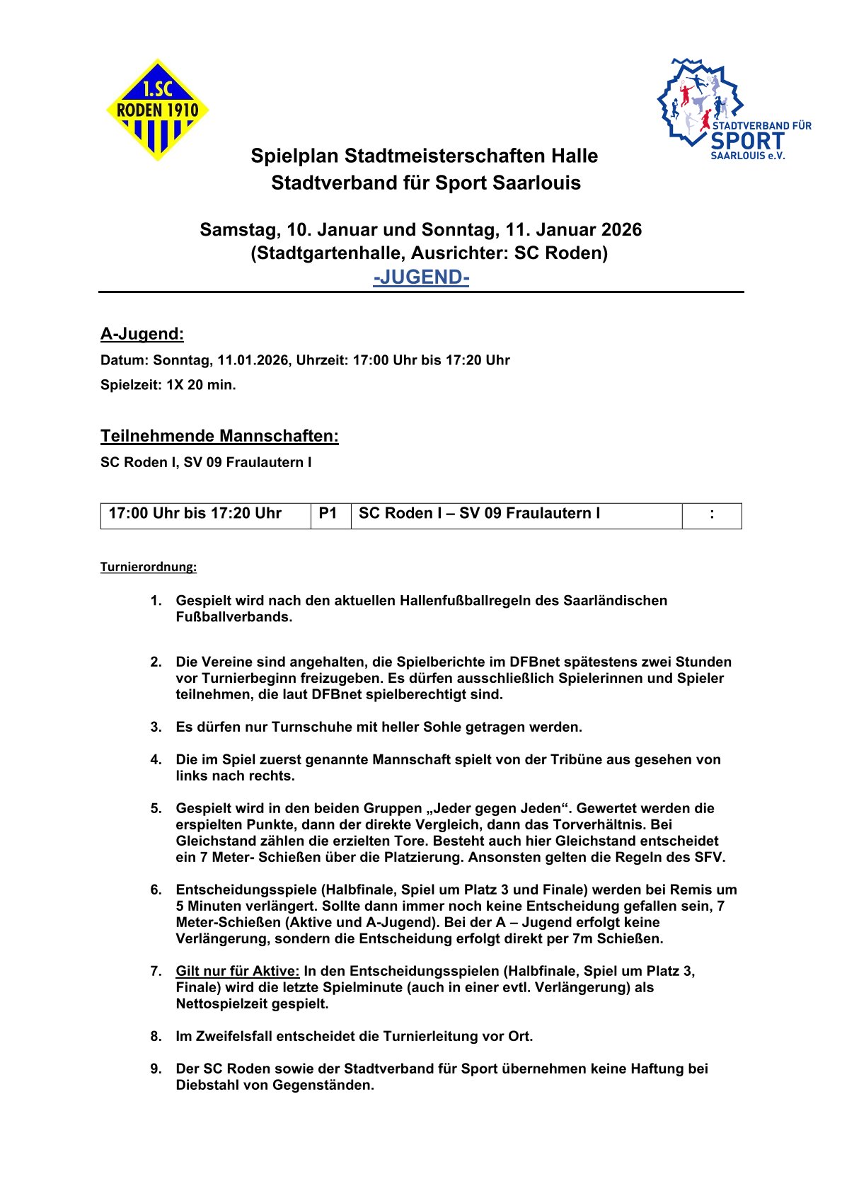 Der Stadtverband für Sport Saarlouis wünscht allen teilnehmenden Mannschaften viel Erfolg und faire Spiele sowie dem diesjährigen Ausrichter, dem SC Roden, ein gutes Gelingen.