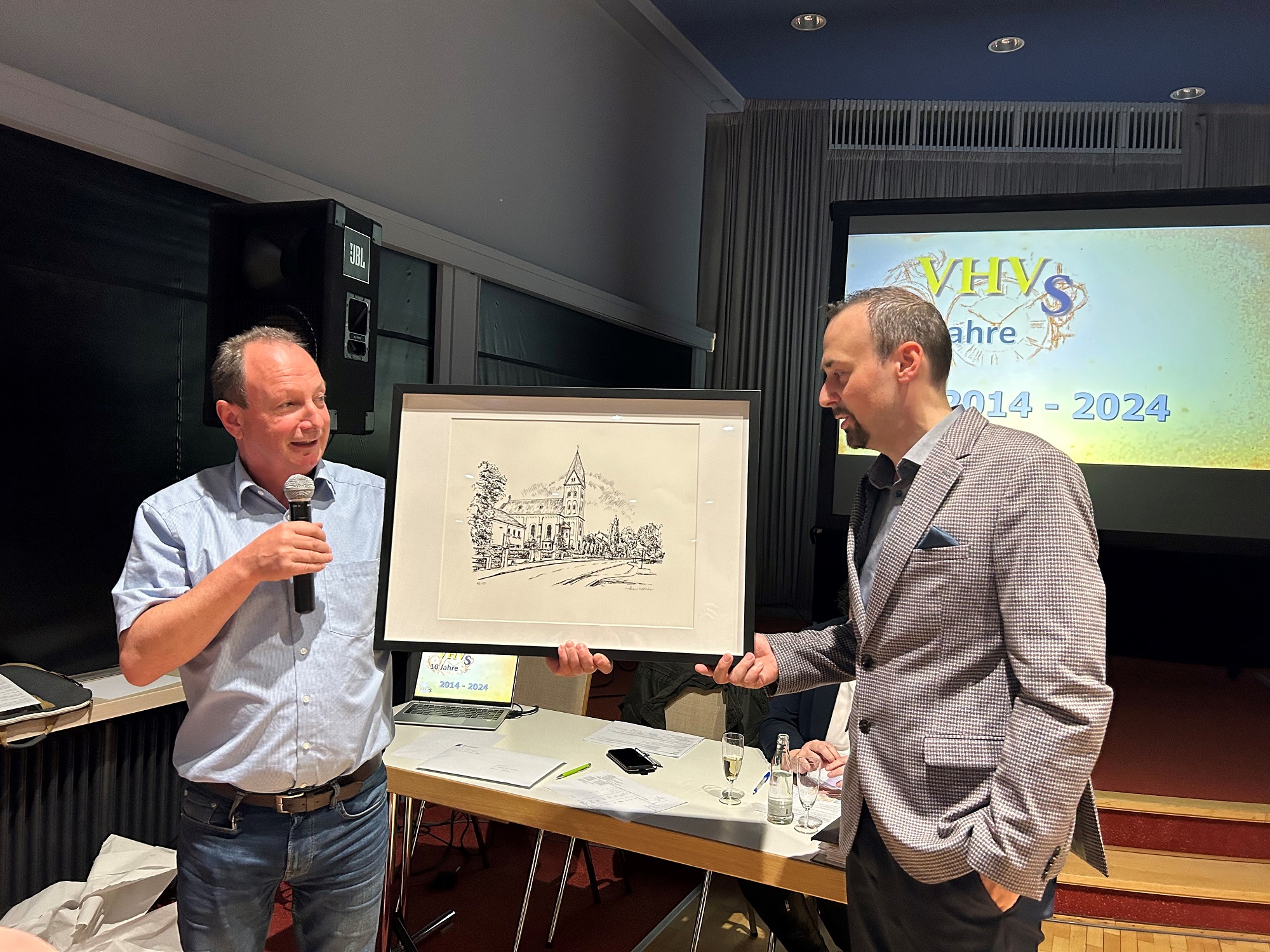 Oberbürgermeister Peter Demmer zeigte sich beeindruckt vom großen Zuspruch und unterstrich, dass die damals getroffene Entscheidung, einen eigenen Verband für die heimatkundliche Forschung zu gründen, der richtige Weg gewesen sei. Er dankte allen Ehrenamtlichen für ihr großes Engagement, dass er gern unterstützt habe, denn die Arbeit sei sehr wichtig für die Nachwelt. Die Landtagsabgeordneten Florian Schäfer und Marc Speicher gratulierten ebenfalls zum Jubiläum. Sie bedankten sich für die Arbeit der Vereine, die sie wertschätzen und unterstützen. Jürgen Baus, stellvertretender Vorsitzender des Verbandes sowie Vorsitzender des Vereins für Mundart und Geschichte Beaumarais, betonte, dass die Erfolgsgeschichte des Verbandes insbesondere Michael Hoen zu verdanken sei. In Anerkennung seiner Arbeit überreichte er ihm eine Zeichnung des Saarlouiser Künstlers Hans Nicola, welche die Kirche von Neuforweiler zeigt. Hoen, der aus Neuforweiler stammt, freute sich sehr über das Bild, das Gerlinde Laurent, die Tochter des Künstlers, gestiftet hatte.
