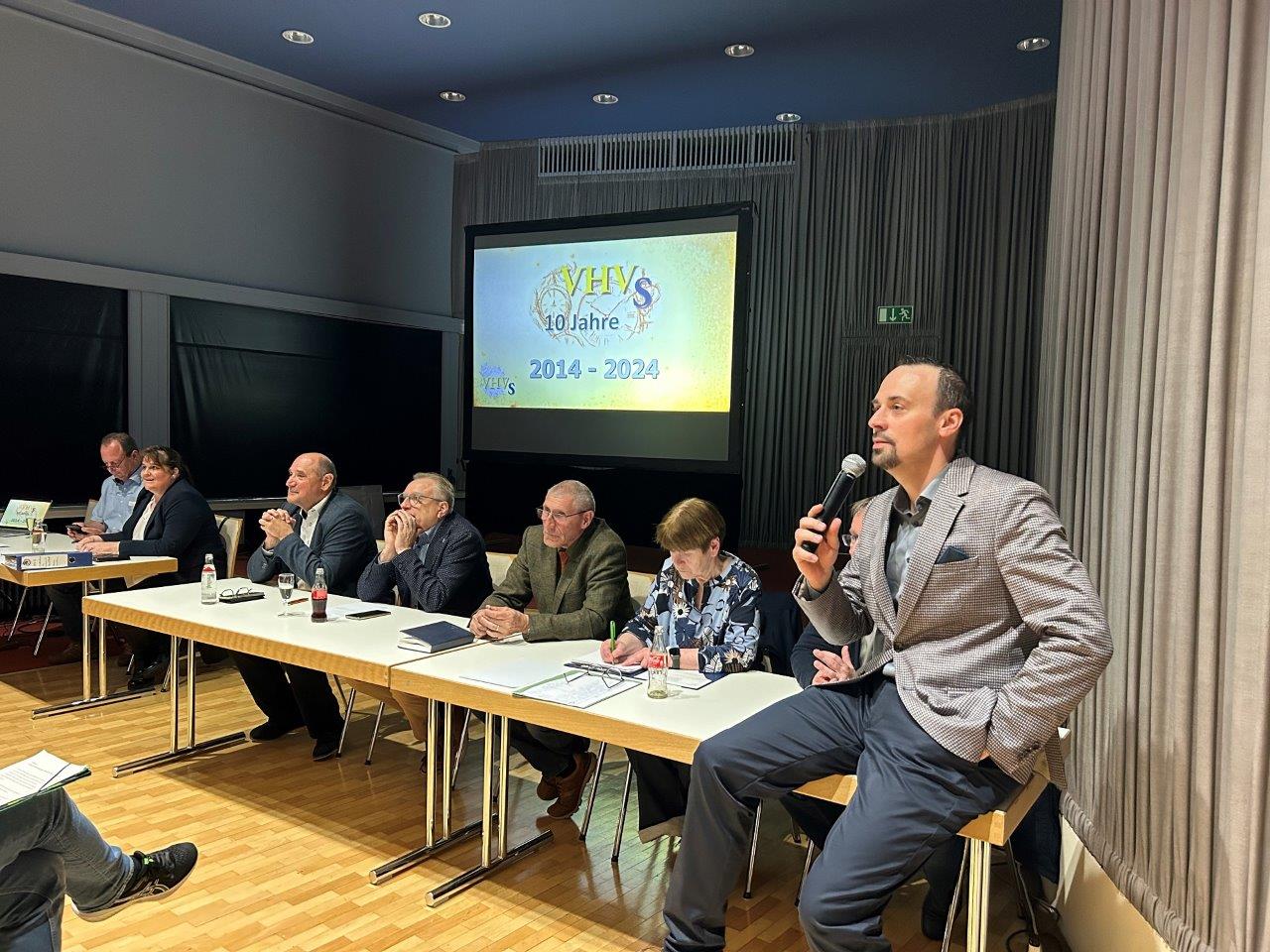 „Vor 10 Jahren gründeten wir mit acht Vereinen und insgesamt 900 Mitgliedern den Verband für heimatkundlich-historische Vereine Saarlouis und heute zählen wir rund 1100 Mitglieder“, sagte Vorsitzender Michael Hoen. Dies sei ein Beleg dafür, dass die Heimatkunde in Saarlouis gut Fahrt aufgenommen habe. Neben der beachtlichen Zahl an Gästen begrüßte Hoen die Saarlouiser Verwaltungsspitze, die acht verbandsangehörigen Vereine sowie Mitglieder aus dem saarländischen Landtag, dem Kreistag und dem Stadtrat. Sein weiterer Gruß galt Michael Sander, Präsident des Landesverbandes der historisch-kulturellen Vereine des Saarlandes sowie den zahlreich erschienenen Vertreter*innen der Vereinigung für Heimatkunde im Landkreis Saarlouis, der Stadtverbände für Kultur und Sport und des Frauenhistorischen Arbeitskreises. Anhand einer von Vorstandsmitglied Herbert Germann gefertigten Beamer-Präsentation gab Hoen einen Überblick über die Veranstaltungen der letzten Jahre. Darunter verschiedene Vortragsreihen zur Ortsgeschichte, Studienfahrten, Ausstellungen, Mundartabende und Buchpräsentationen. Für die Zukunft plant der Verband einen Auftritt in den sozialen Netzwerken und eine jährliche Auszeichnung für besondere Leistungen rund um die Heimatkunde. Für die kommenden Monate sind bereits eine Tagesfahrt und eine weitere Vortragsreihe avisiert.