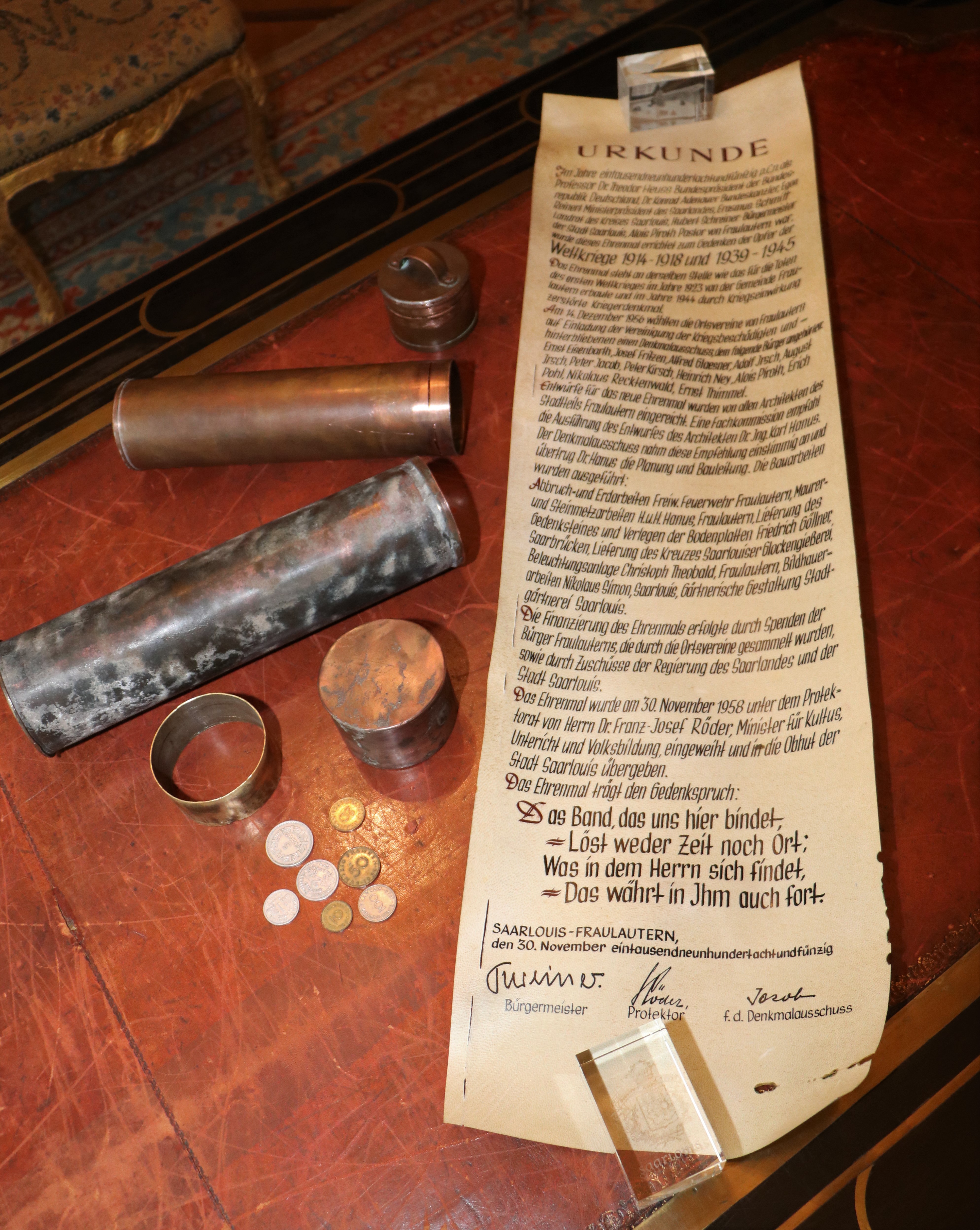 Die Munitionshülse wurde abgesägt und mit einem flachen Deckel versehen, in diese wurde eine weitere Hülse eingelegt, die eine große Urkunde und sieben Münzen enthielt. Drei davon sind Französische Francs aus der Nachkriegszeit, Nennwerte: 1, 2 und 5 Francs. Die weiteren vier Münzen sind Saar- Franken, Nennwerte: 10, 20, 50 und 100 Saar-Franken.