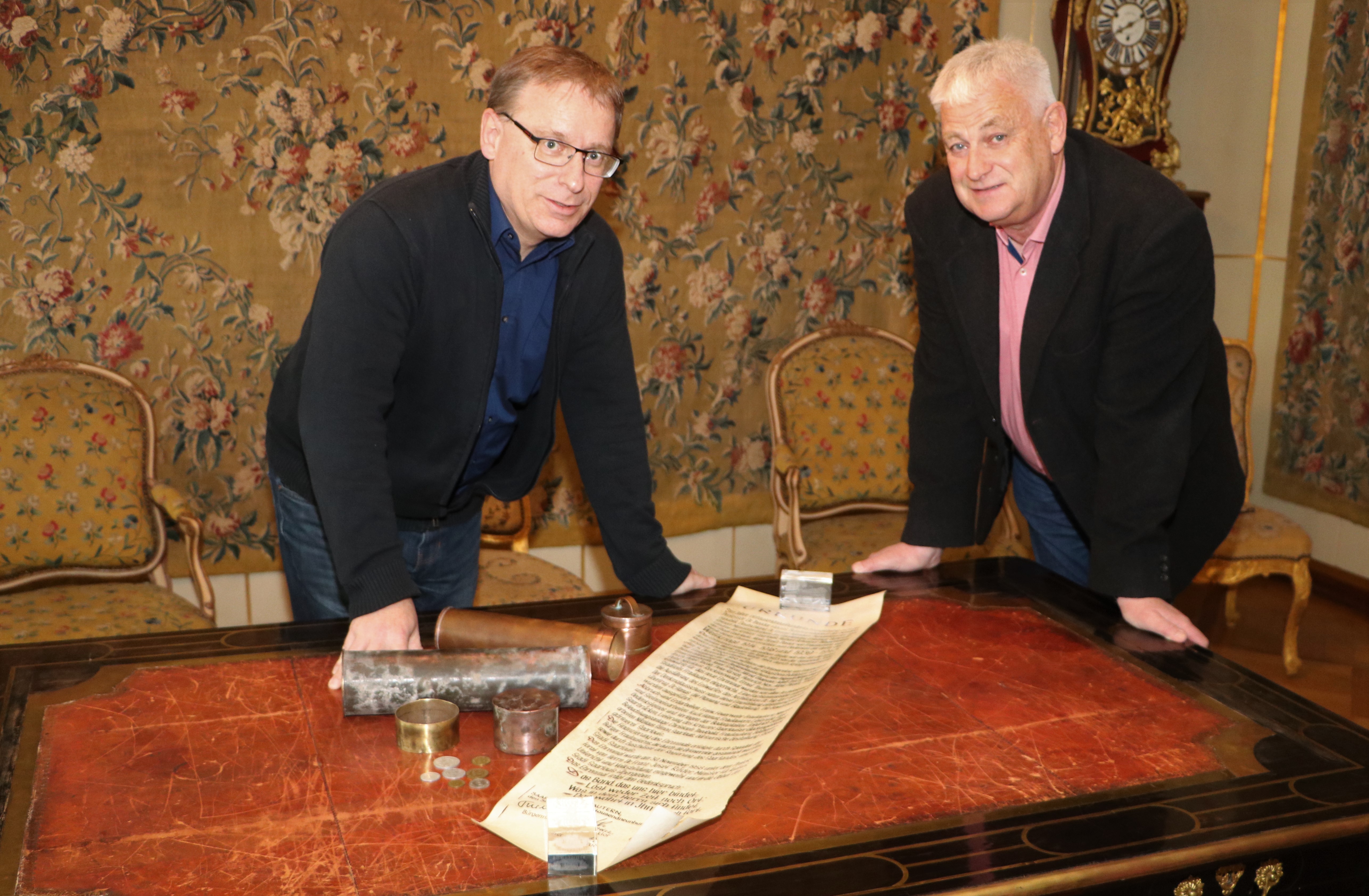 Oberbürgermeister Peter Demmer ließ das Fundstück aus Sicherheitsgründen vom Kampfmittelräumdienst der saarländischen Polizei öffnen und warf gemeinsam mit dem Leiter des städtischen Museums einen Blick hinein.