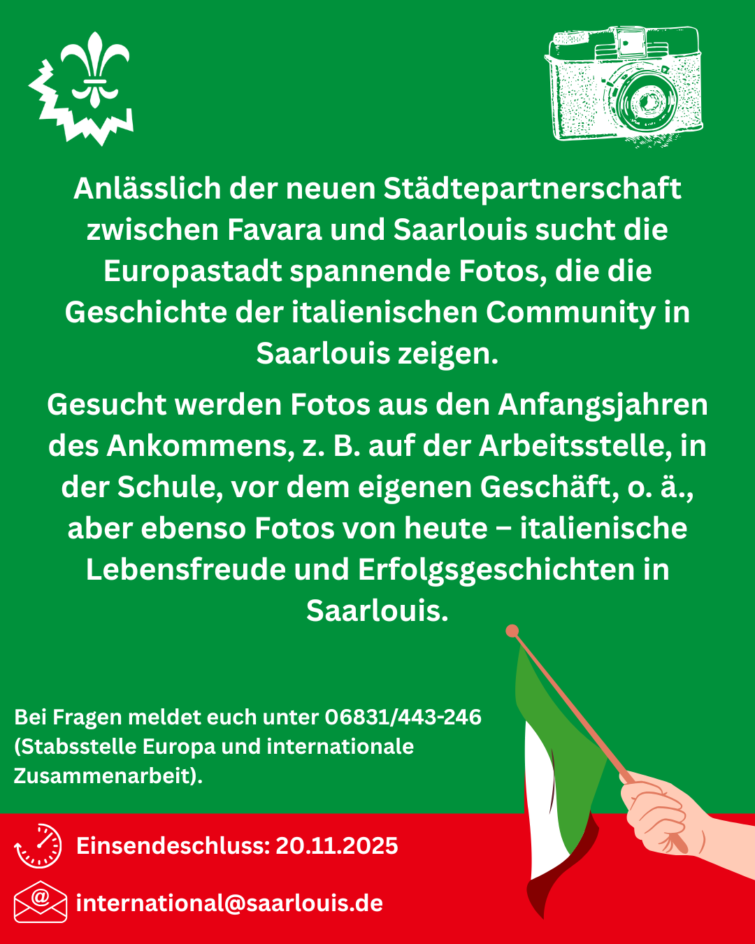 Stöbern Sie in Ihren Alben und Archiven und senden Sie Ihre „Schätze“ bis zum 20.11.2025 an international@saarlouis.de. Bei Fragen erreichen Sie uns unter 06831/443-246 (Stabsstelle Europa und internationale Zusammenarbeit).