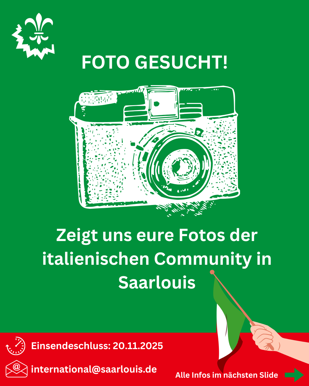 Gesucht werden Fotos aus den Anfangsjahren des Ankommens, z. B. auf der Arbeitsstelle, in der Schule, vor dem eigenen Geschäft, bei einer Veranstaltung, bei einem Fest, bei einer Ehrung, zu Hause o. ä., aber ebenso Fotos von heute – italienische Lebensfreude und Erfolgsgeschichten in Saarlouis.