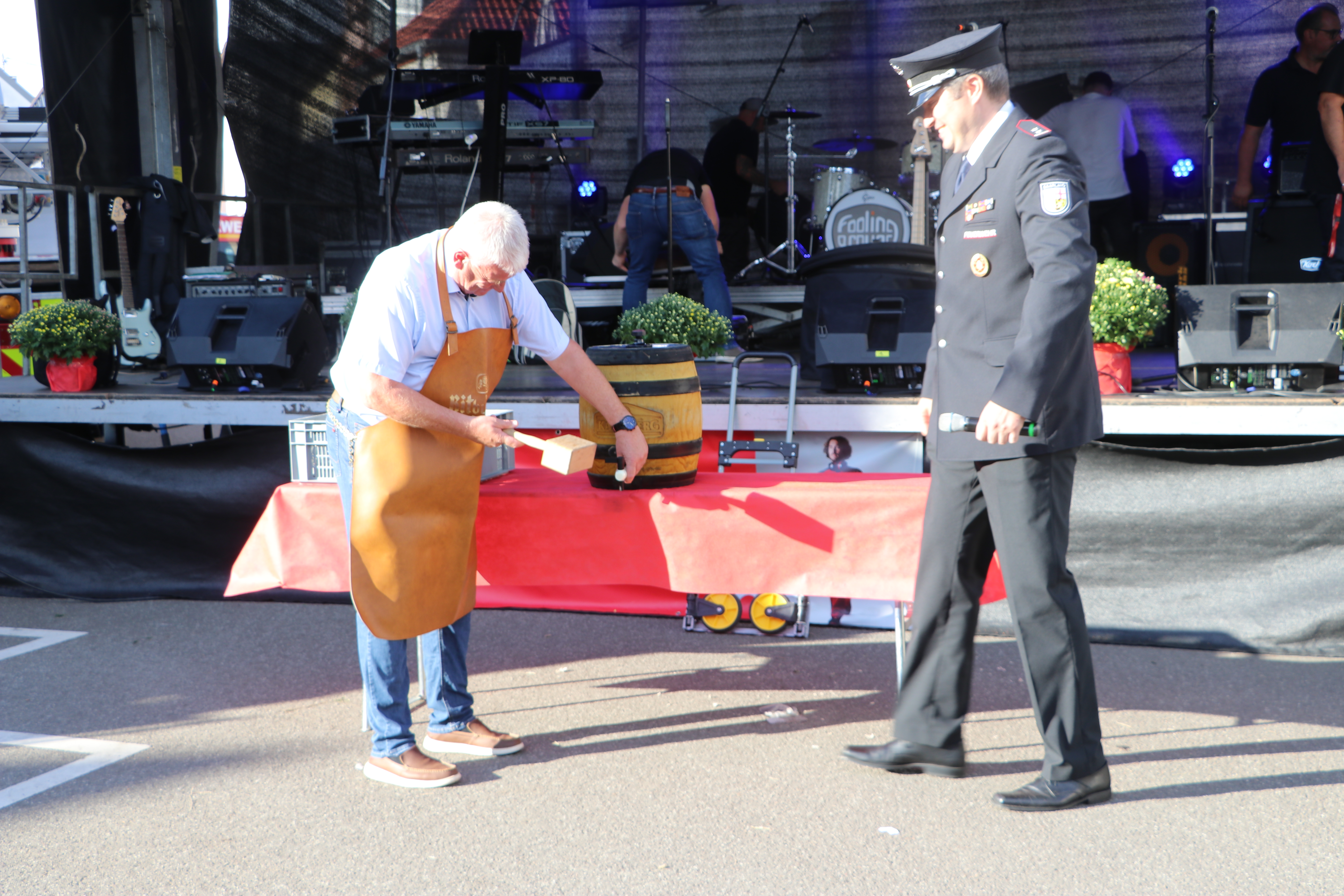Oberbürgermeister Peter Demmer und Löschbezirksführer Christopher Freichel beim Fassanstich in Lisdorf.