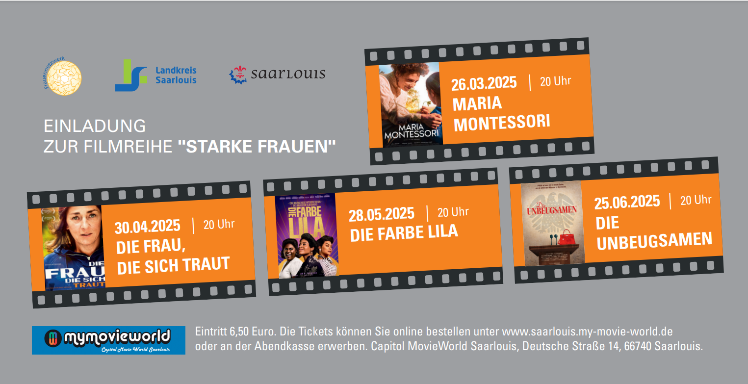 Die Frauenbeauftragten und das Frauennetzwerk im Landkreis Saarlouis laden zusammen mit dem Saarlouiser Kino herzlich ein zu der Fortsetzung einer erfolgreichen und besonderen Filmreihe. Im Vierwochen Rhythmus werden vier Filme gezeigt die alle eins gemeinsam haben, 100 Prozent starke Frauen in der Hauptrolle. Im Vergleich zu den erfolgreichsten Kinofilmen der Welt ist das schon ein riesen Unterschied, denn dort sind gerade mal 12 Prozent der Hauptdarstellerinnen weiblich.