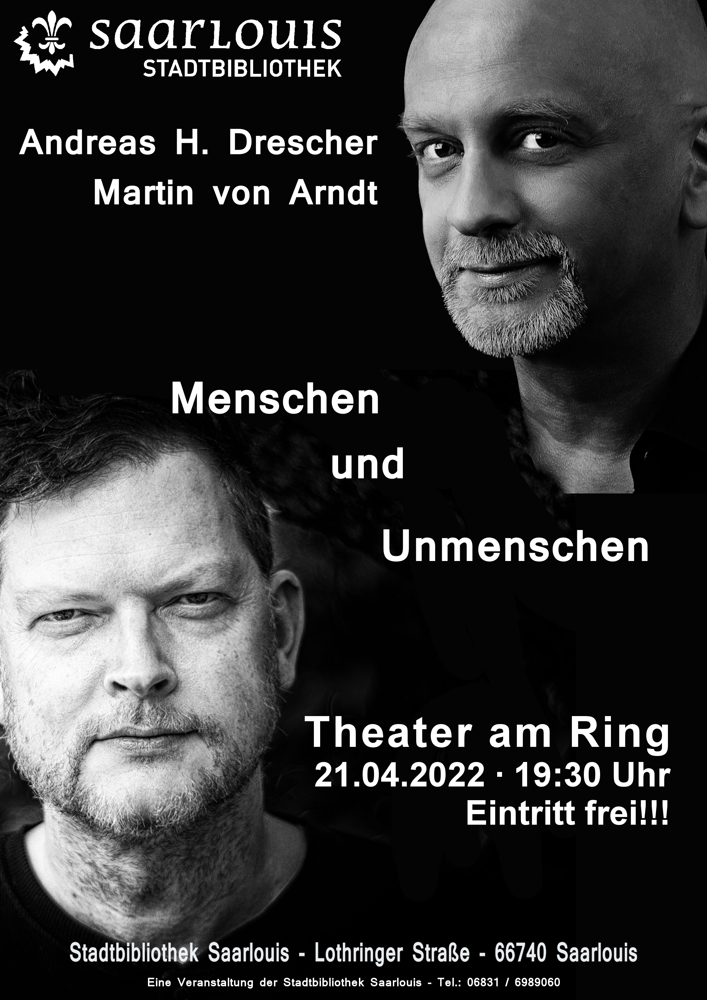„Menschen und Unmenschen“ eine Lesung der Stadtbibliothek Saarlouis mit den beiden Autoren Martin von Arndt und Andreas H. Drescher im Theater am Ring Saarlouis