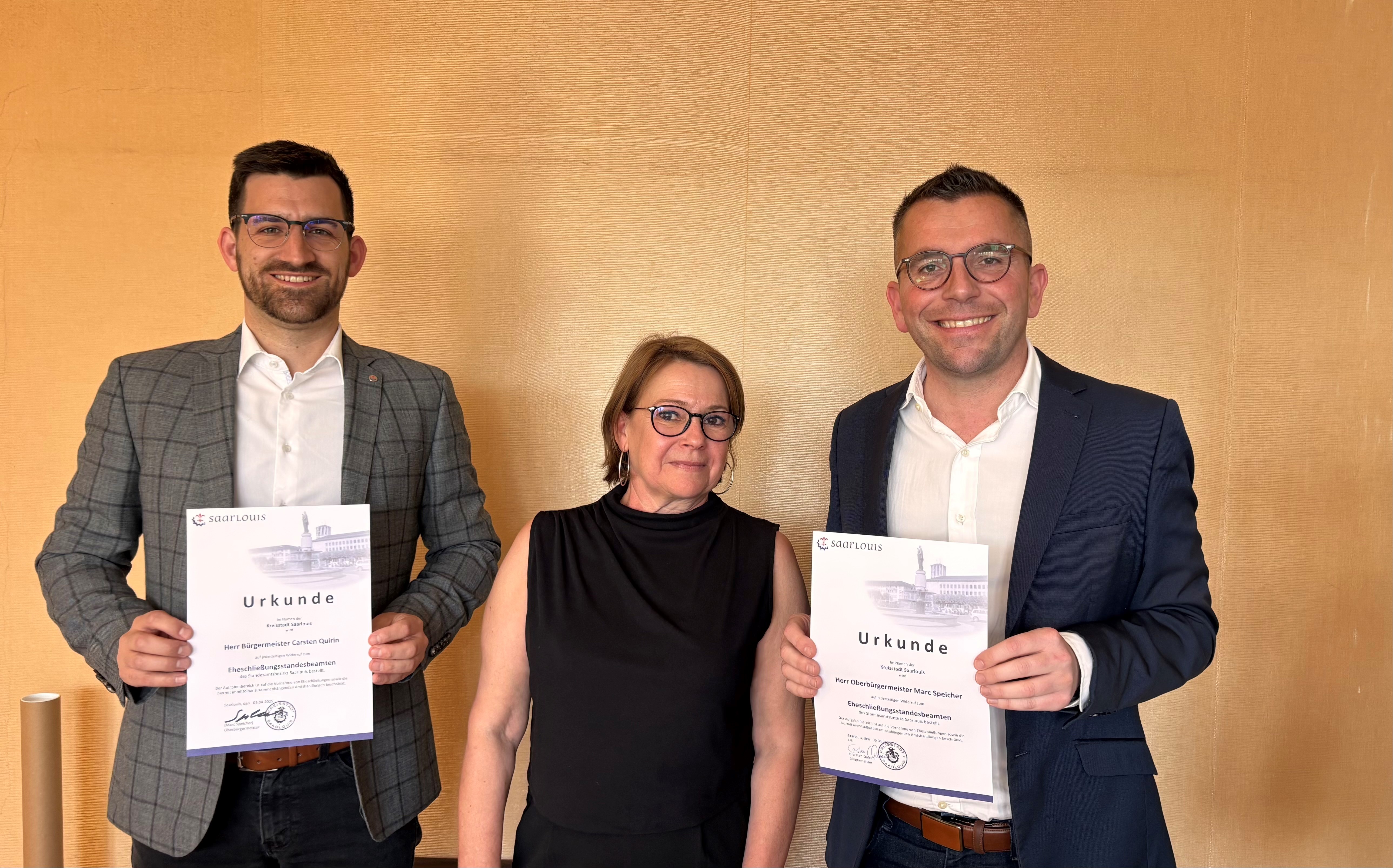 Oberbürgermeister Marc Speicher und Bürgermeister Carsten Quirin haben nun ganz offiziell die „Lizenz zum Trauen“. Nach dem erfolgreichen Abschluss eines Lehrgangs an der Akademie für Personenstandwesen im hessischen Bad Salzschlirf sind beide nun berechtigt, standesamtliche Trauungen durchzuführen.