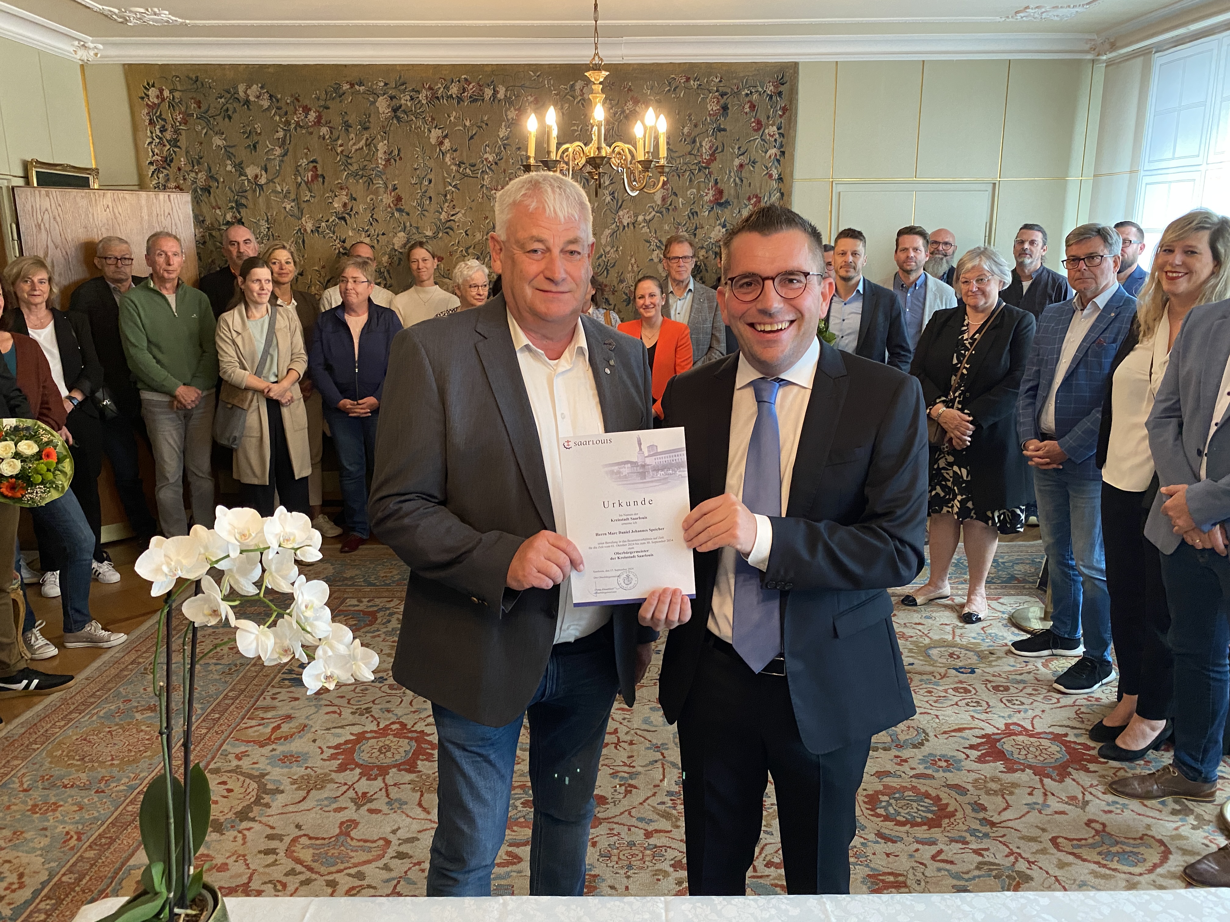 Mit dem Amtseid auf das Grundgesetz und die Verfassung des Saarlandes wurde Marc Speicher (CDU) heute zum neuen Oberbürgermeister der Kreisstadt Saarlouis vereidigt. Der noch amtierende Oberbürgermeister Peter Demmer (SPD) überreichte ihm die Ernennungsurkunde für seine Amtszeit, die am 1. Oktober beginnt und die bis Ende September 2034 dauern wird. Es sei ein besonderer Tag, hob OB Demmer hervor, denn die Vereidigung eines neuen Oberbürgermeisters bedeute auch immer eine Zeitenwende für die Stadt. „Die Aufgabe als OB ist anspruchsvoll, aber sie bereitet auch Freude“, sagte Speicher. „Im Vordergrund stehen dabei die Interessen der Bürgerinnen und Bürger in den acht Saarlouiser Stadtteilen.“ Bei OB Peter Demmer bedankte er sich für den guten Austausch in den letzten Wochen und Monaten.