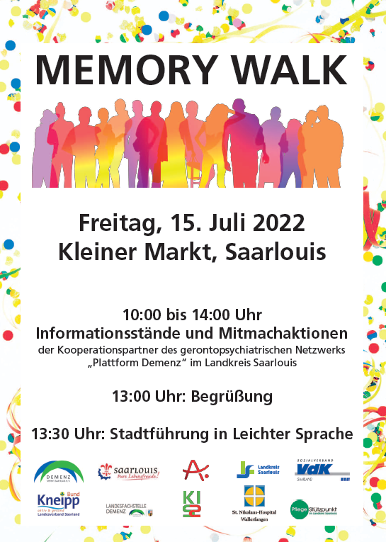 Das gerontopsychiatrische Netzwerk „Plattform Demenz“ im Landkreis Saarlouis veranstaltet gemeinsam dem Demenz-Verein Saarlouis e.V., der Kreisstadt Saarlouis mit Seniorenmoderatorin, Seniorenbeirat und vhs, der Landesfachstelle Demenz Saarland, dem Landkreis Saarlouis mit Leitstelle „Älter Werden“ und Pflegestützpunkt, dem St. Nikolaus Hospital Wallerfangen, dem VdK-Kreisverband Saarlouis, dem KISS e.V., dem Kneipp-Bund LV Saarland e.V. sowie dem Deutsche Alzheimer Gesellschaft LV Saarland e.V. einen
