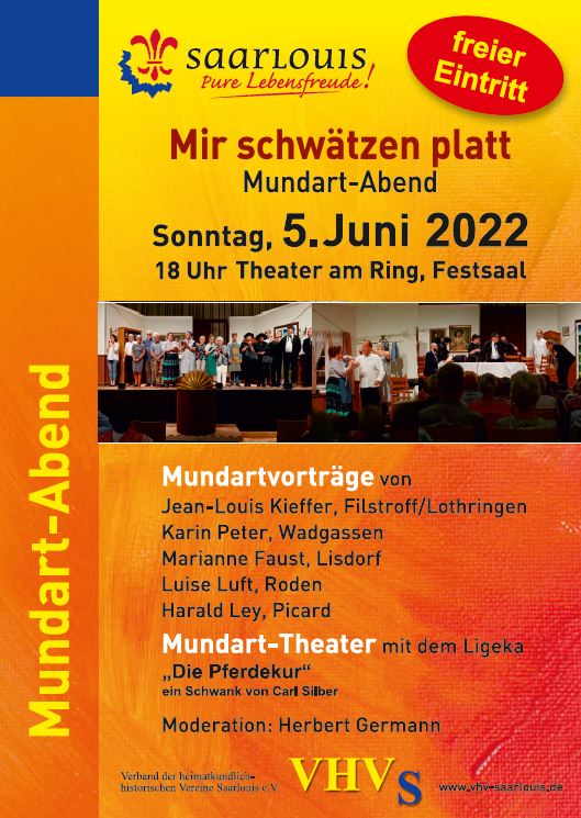 „Mir schwätzen platt“ heißt es am Sonntag, 5. Juni, beim Mundart-Abend im Theater am Ring, der dort im Rahmen der Saarlouiser Woche stattfindet. Mit dabei sind Mundartvorträge von Jean-Louis Kieffer aus dem lothringischen Filstroff, Karin Peter, Marianne Faus, Luise Luft und Harald Ley (alle aus dem Kreis und Stadt Saarlouis).