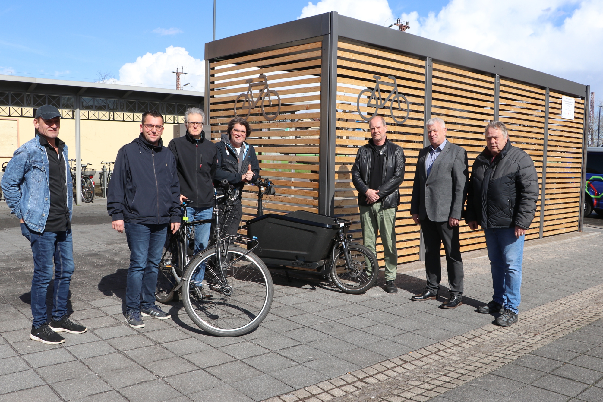 In Betrieb genommen: BGO Günter Melchior (3. von rechts) und OB Peter Demmer (2. von rechts) haben die neue Fahrradsammelschließanlage am Bahnhof zusammen mit dem städtischen Fahrradbeauftragten Reiner Körner (3. von links) und Vertretern der Stadtratsfraktionen vorgestellt. Fotos: Sascha Schmidt