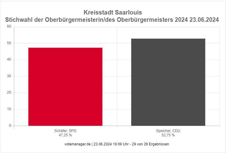 Mit 52,75 Prozent hat Marc Speicher (CDU) die Stichwahl um das Amt des Saarlouiser Oberbürgermeisters für sich entschieden. Damit wird der 39-Jährige im Oktober neuer Verwaltungschef im Saarlouiser Rathaus. Auf seinen Gegenbewerber Florian Schäfer (SPD) entfielen 47,25 Prozent der Stimmen. Insgesamt waren 27.728 Wahlberechtigte zur Wahl aufgerufen, die Wahlbeteiligung betrug 48,05 Prozent.