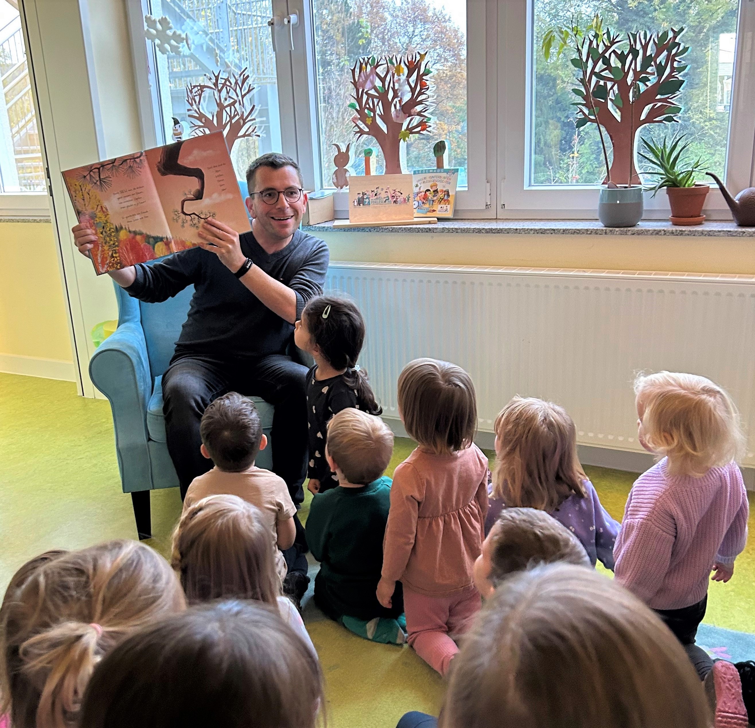 Anlässlich des bundesweiten Vorlesetags 2024 hat Oberbürgermeister Marc Speicher das Kinderhaus Cinderella besucht, um den kleinen Zuhörern vorzulesen. Mit viel Charme und seiner lebhaften Erzählweise zog er die Kinder in seinen Bann.