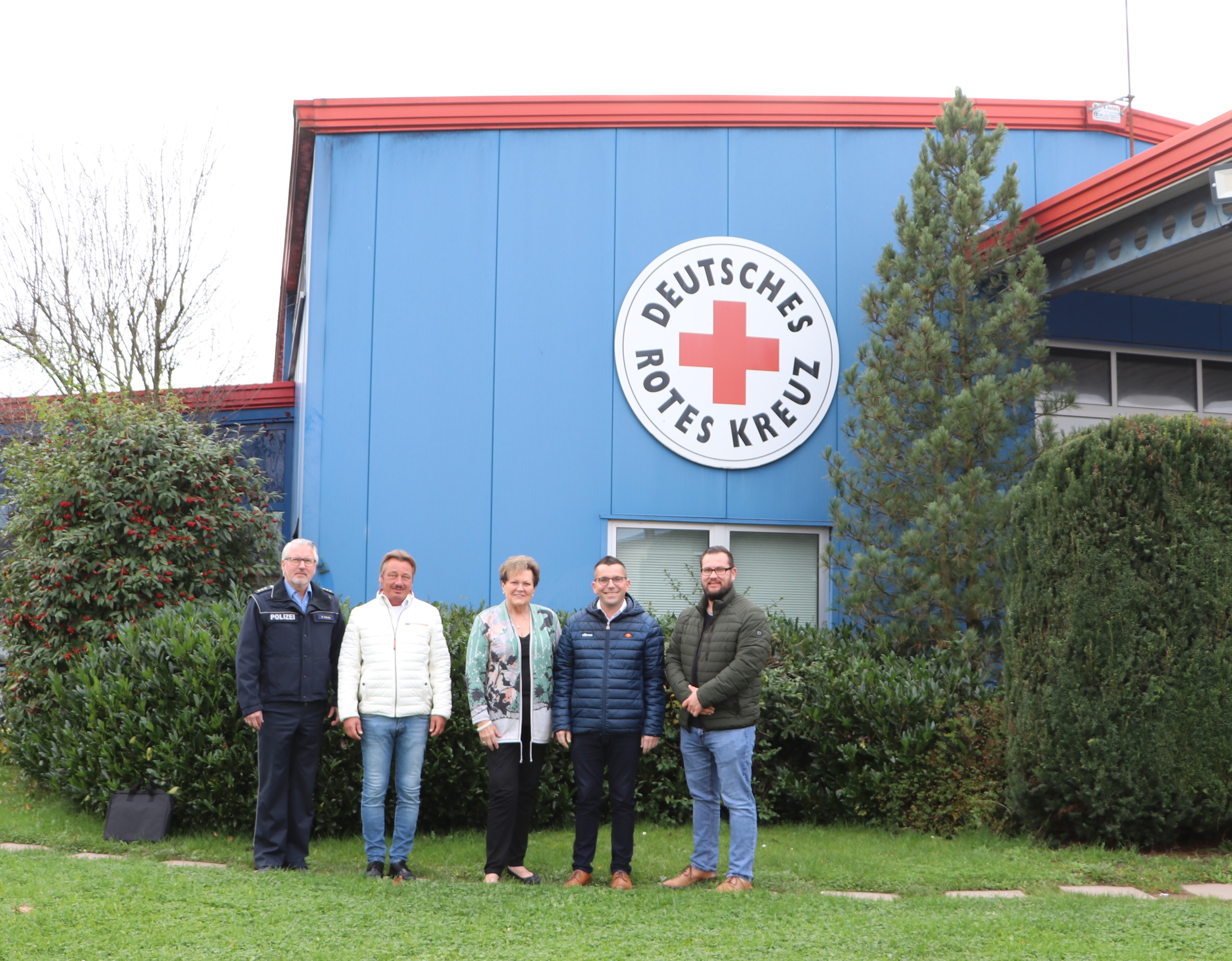 v.l. Stefan Schmitz (Polizeidirektor), Aljoscha Struck (Kreisgeschäftsführer DRK), Monika Bachmann (Kreisvorsitzende des DRK Saarlouis und Ministerin a.D.), Oberbürgermeister Marc Speicher und Christian Bost (Amtsleiter Amt für Ordnung und Bürgerdienste)