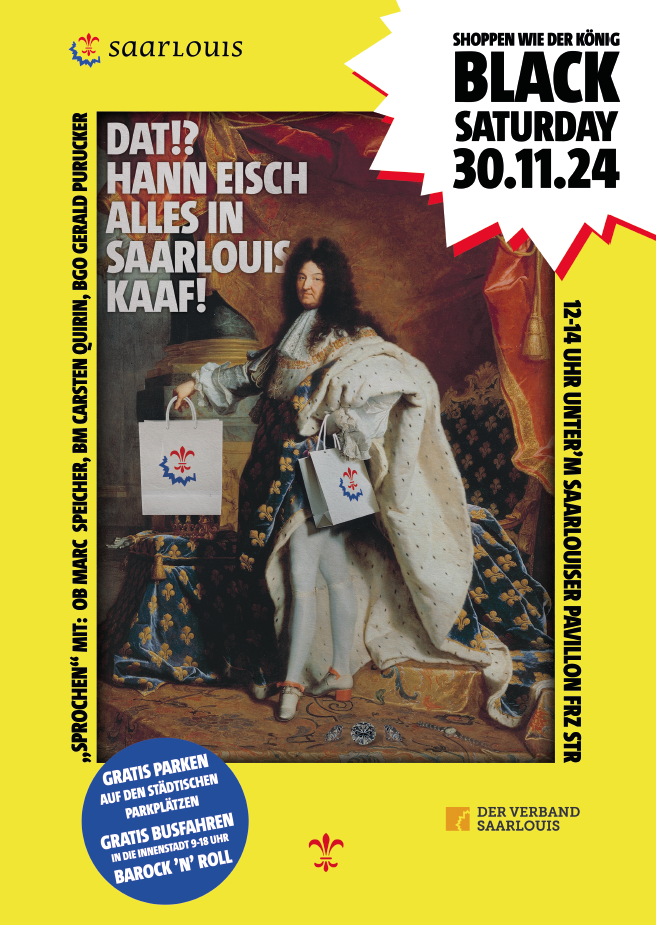 Die Kreis- und Europastadt Saarlouis lädt am Samstag, den 30. November 2024, zum „Black Saturday“ ein. „Mir ist es wichtig, dass wir unsere schöne Stadt Saarlouis wieder stärker als Einkaufsstadt herausstellen. Saarlouis ist eine tolle Stadt und wir wollen als neues Team im Rathaus neue Wege gehen. Der Black Saturday ist unsere selbstbewusste Antwort auf den reinen Onlinehandel. Ich freue mich, dass auch der Verband meine Idee unterstützt. Wir machen für die Besucher das Parken auf allen städtischen Parkplätzen kostenlos. Außerdem ist das Busfahren in Saarlouis vom 9-18 Uhr kostenlos“, so der neue Oberbürgermeister Marc Speicher. „Wir sagen: Kommt in die Einkaufsstadt Saarlouis zum Scheesen und Sprochen am Black Saturday.“