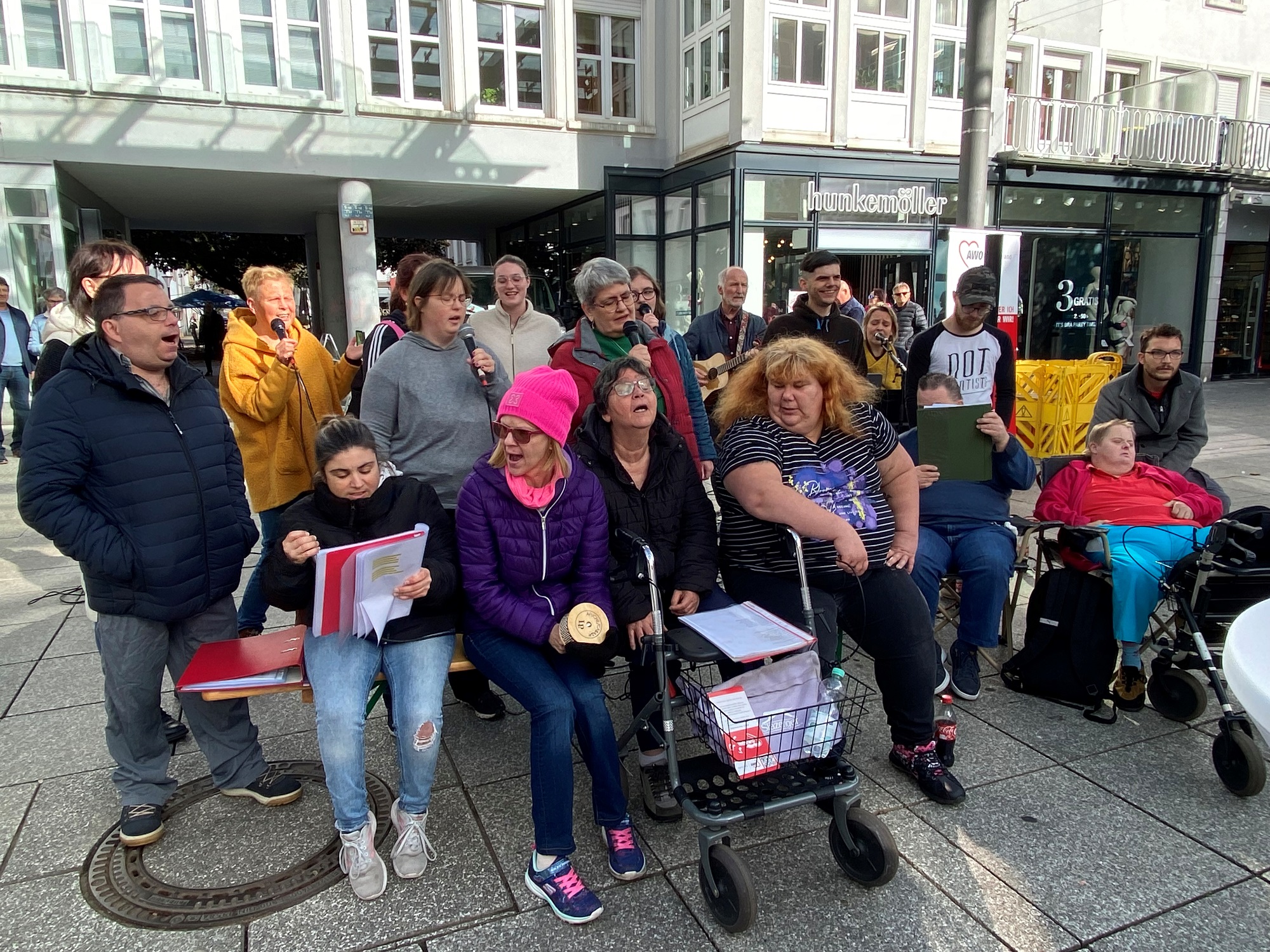 Monika Gessinger, stellv. Beauftragte für Menschen mit Behinderung der Kreisstadt Saarlouis hatte die Idee zu einem Open-Air-Konzert der AWO Herzrocker in Saarlouis. Bei schönstem Wetter gaben die Sängerinnen und Sänger unter der Leitung von Birte Steinmetz ein rund zweistündiges Konzert. Mit ihren emotionalen und nachdenklichen Liedern brachten die Herzrocker zahlreiche Passanten dazu, auch länger stehenzubleiben und sich von der Lebensfreude des Chores anstecken zu lassen. Viele stimmten in die vorgetragenen Songs von Udo Lindenberg, den Toten Hosen u.a. ein, sangen mit und spendeten nicht nur viel Beifall, sondern auch Geld, dass der Finanzierung des Bandprojektes zu Gute kommt.