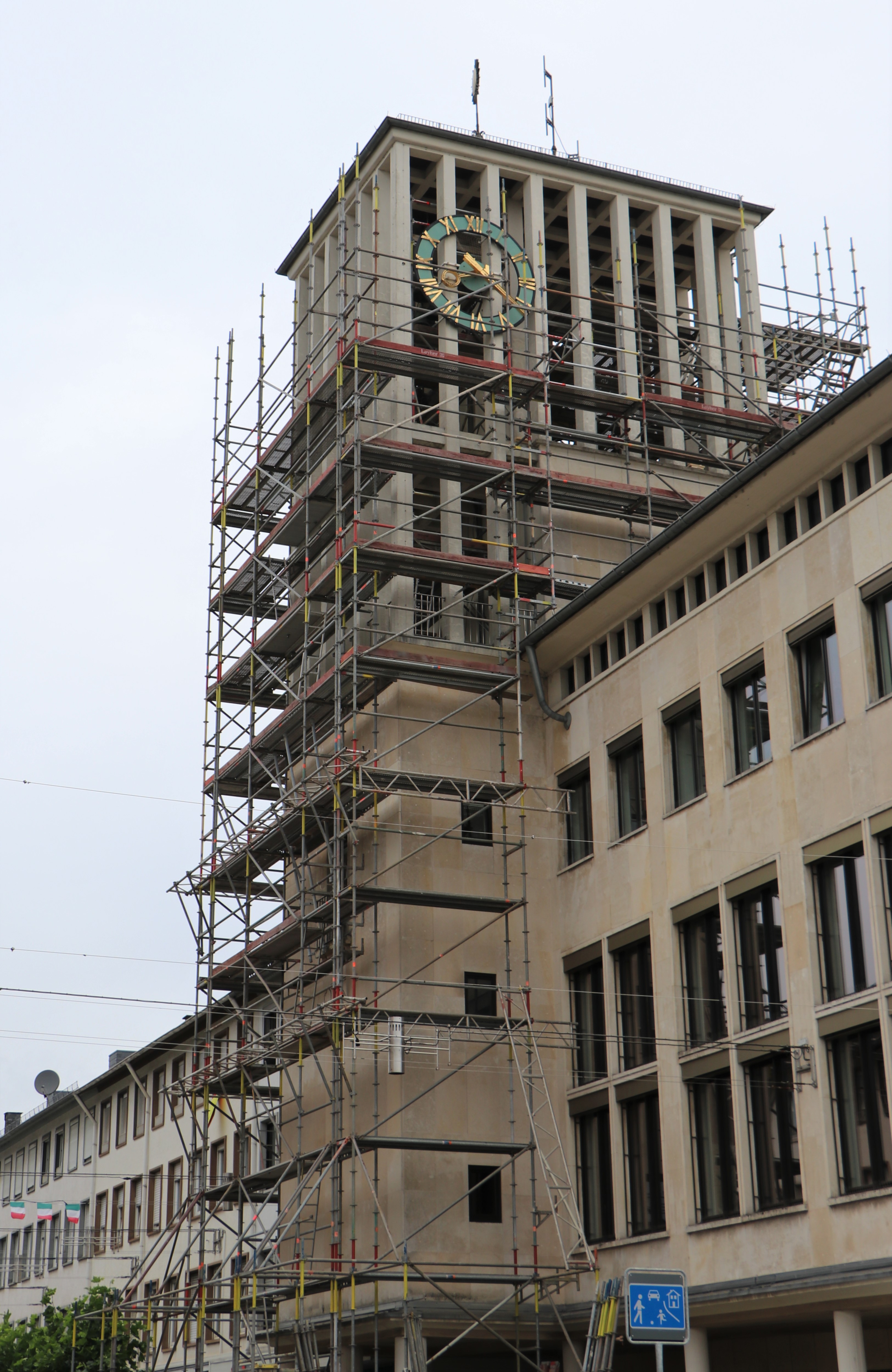 Die Stadtverwaltung teilt mit, dass aufgrund von Sanierungsarbeiten am Glockenturm des Rathauses das Glockenspiel sowie die Turmuhr vorübergehend abgeschaltet werden. Die Arbeiten umfassen die Beschichtung der Stahlbetonstützen mit einem Schutzanstrich, die Überprüfung der Turmuhr und die Montage eines neuen Taubenschutznetzes.