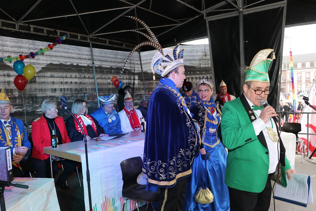 Um ihren Anspruch auf Regentschaft schon im Voraus in der ganzen Stadt bekannt zu machen, zogen die Karnevalsvereine unter dem Jubel der Bürgerschaft mit einem Festumzug vom Kleinen bis zum Großen Markt und suchten Unterstützung durch karnevalistische Expertise bei Schorsch Seitz und Fidelio, die der schweren Verhandlung mit munteren Tönen zur Seite standen.