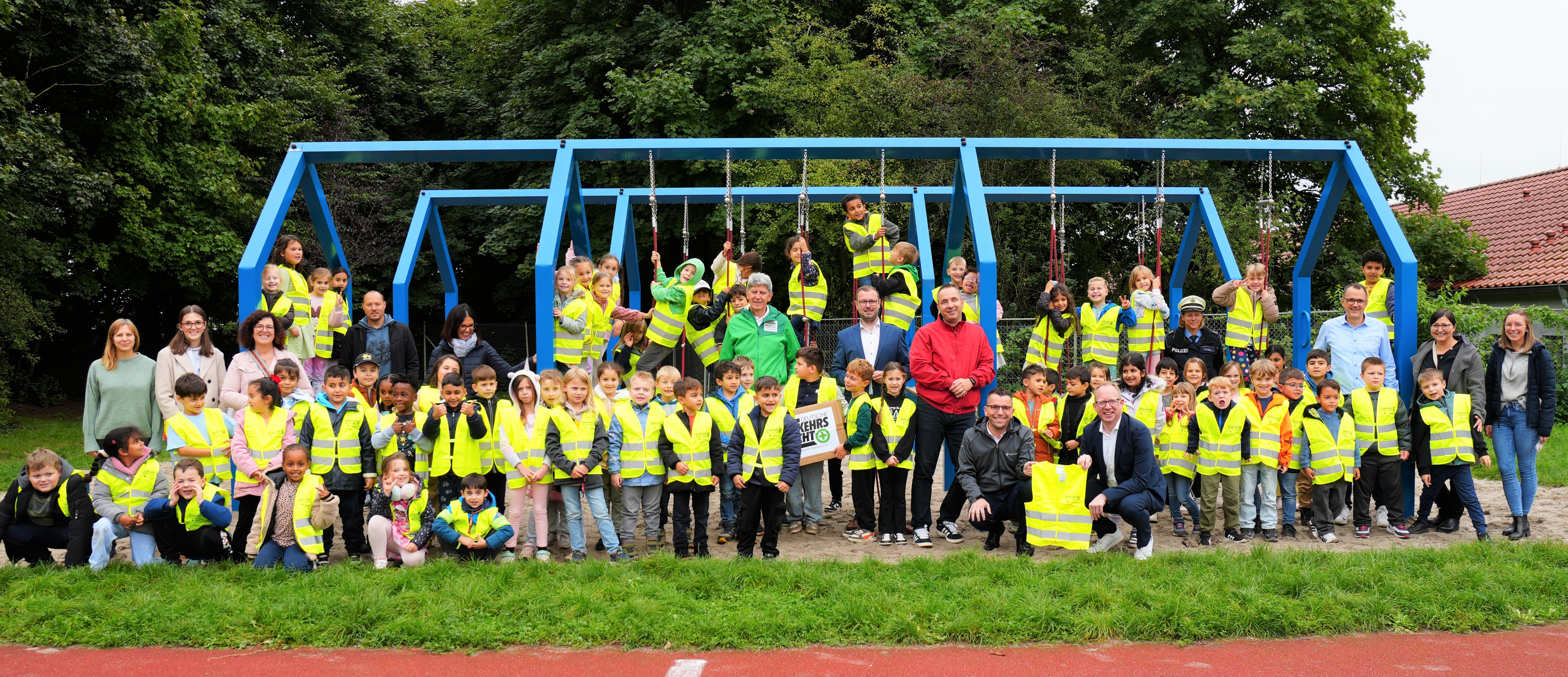 Oberbürgermeister Marc Speicher ließ es sich ebenfalls nicht nehmen, persönlich bei der Übergabe dabei zu sein: „Unsere Kinder sollen sicher in der Stadt unterwegs sein – ob auf dem Weg zur Schule, zum Sport oder zu Freunden. Die Warnwesten sind ein einfaches, aber wirkungsvolles Mittel, um die Sichtbarkeit zu erhöhen und Unfälle zu vermeiden. Ich danke allen Partnern, die sich hier gemeinsam für die Sicherheit unserer Jüngsten engagieren.“