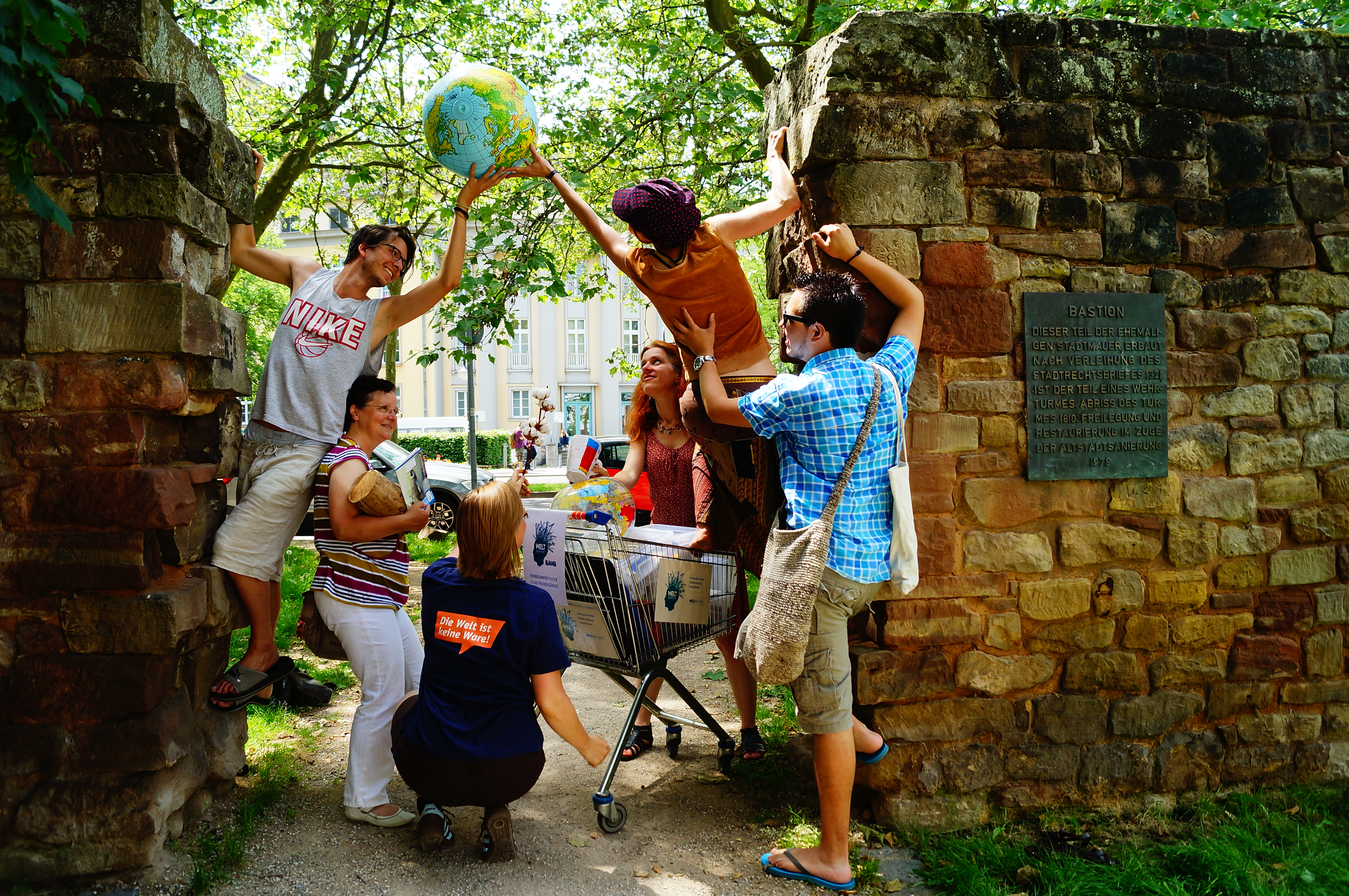 Referierende des Netzwerks Entwicklungspolitik im Saarland (NES) e.V. zeigen den Teilnehmenden, welche Auswirkungen auf die Umwelt von weit transportieren Lebensmitteln ausgehen. Sie zeigen beim Stadtspaziergang durch Saarlouis, worauf man beim Einkaufen achten kann, um nachhaltig und umweltbewusst einzukaufen.
