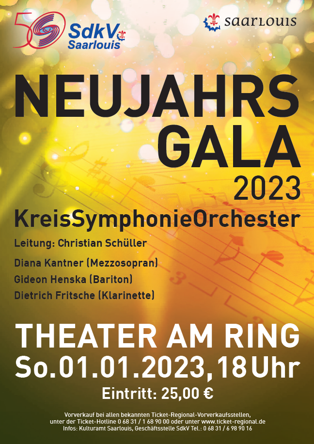 Am Sonntag, 1. Januar 2023 um 18 Uhr präsentiert der Stadtverband der kulturellen Vereine Saarlouis die Neujahrs-Gala im Theater am Ring in Saarlouis. Es spielt das KreisSymphonieOrchester unter Leitung von Christian Schüller. Eine Solistin und zwei Solisten sind mit dabei. Tickets sind ab sofort erhältlich.