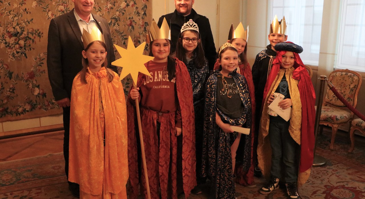 Dort sangen die Sternsinger gemeinsam mit Kaplan Carsten Mayer den „Stern über Bethlehem“ und überreichten dem Verwaltungschef den Segen mit einem Segensspruch.